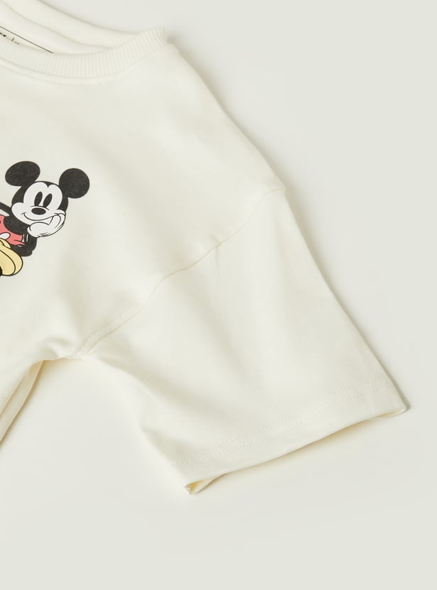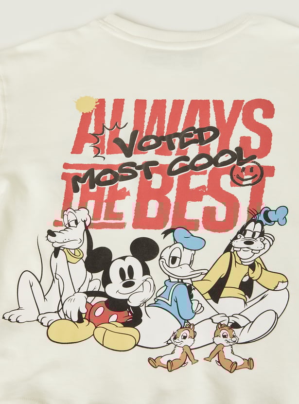 This Mickey Mouse print T-shirt features a classic crew neckline and half sleeves, creating a comfortable, easy-wear silhouette. Bold front and back prints add a fun, standout touch that brings character-led style to everyday dressing.