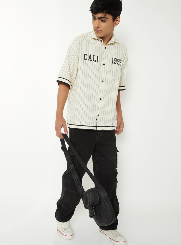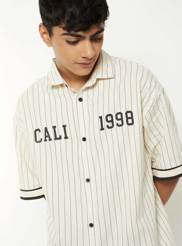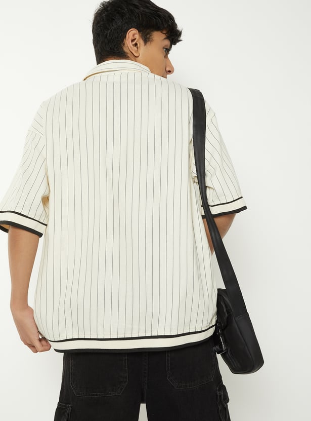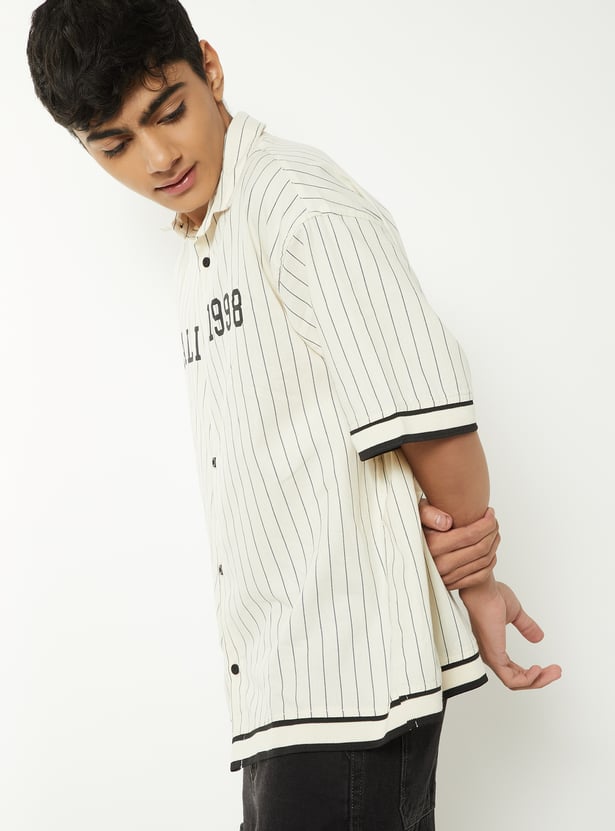 This striped oversized shirt features a laid-back spread collar, classic button placket, and relaxed half sleeves. Perfect for vacation vibes or casual summer days with effortless style.