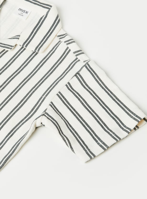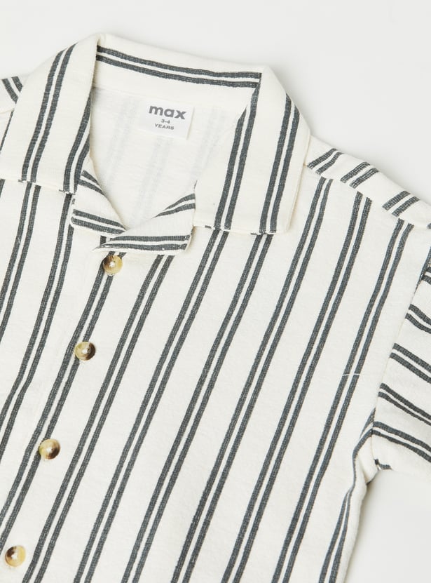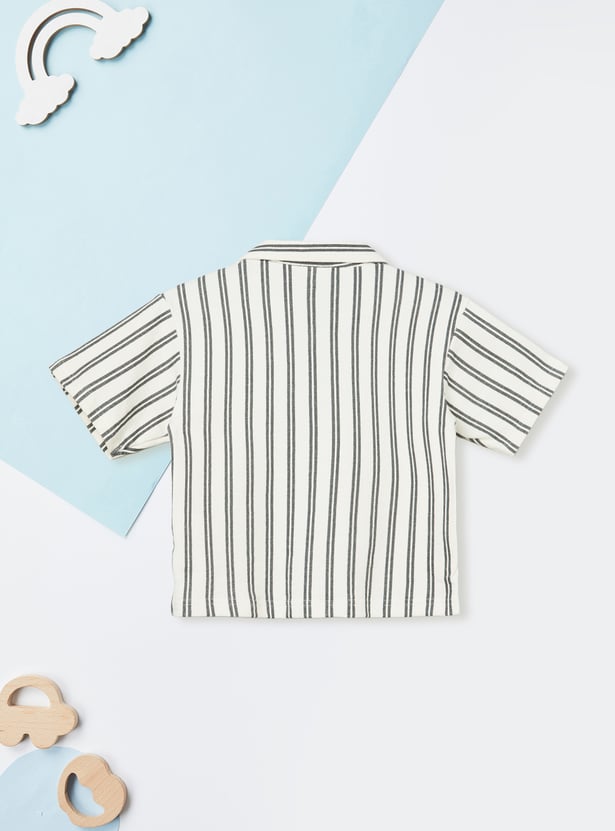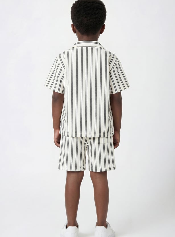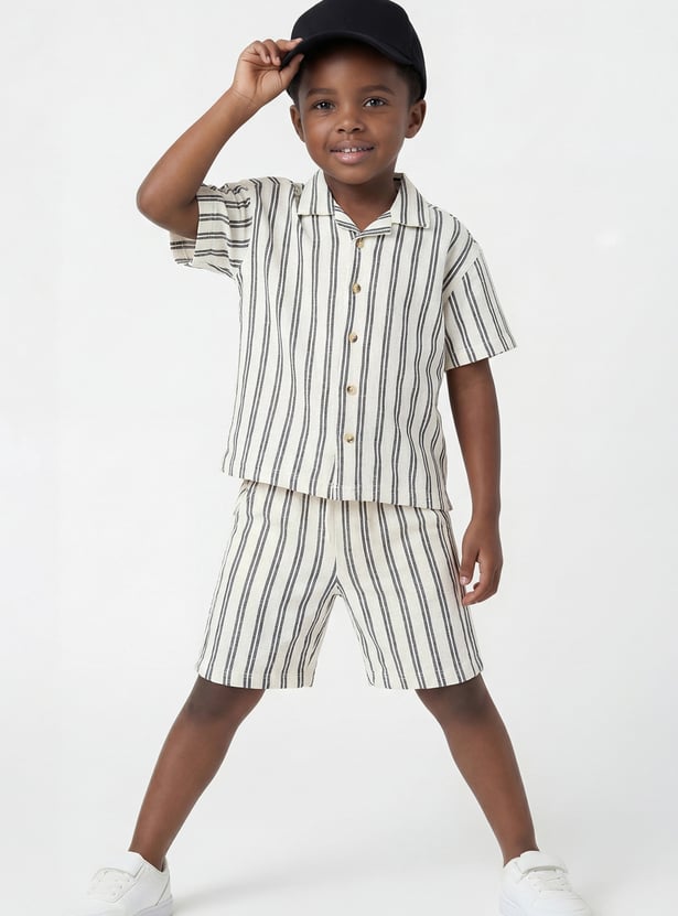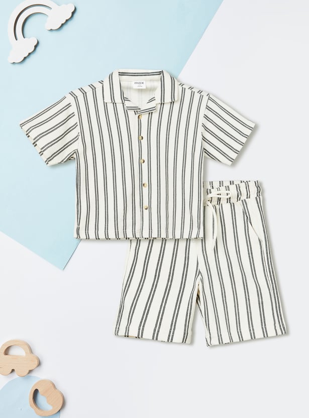 Spruce up your little one's casual wardrobe with the addition of this striped shirt that features a resort collar and half sleeves. It is complemented by a pair of striped elasticated shorts.
