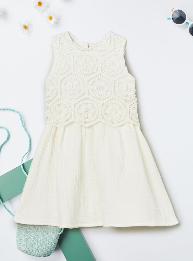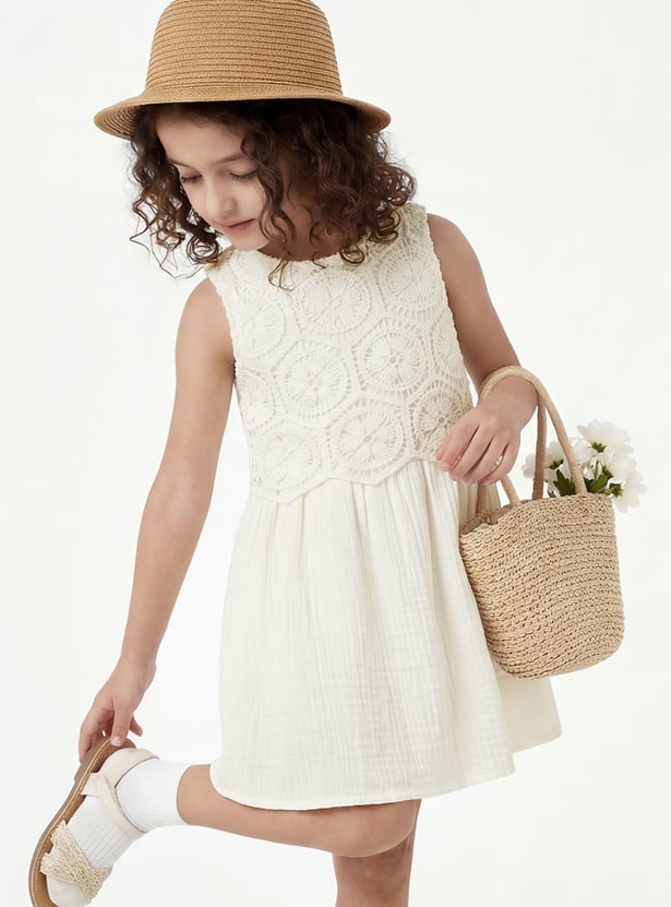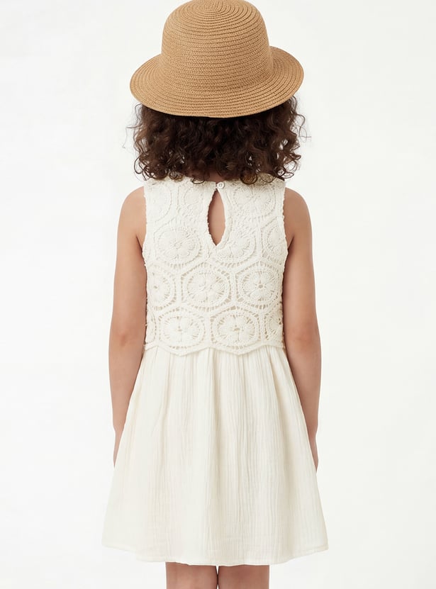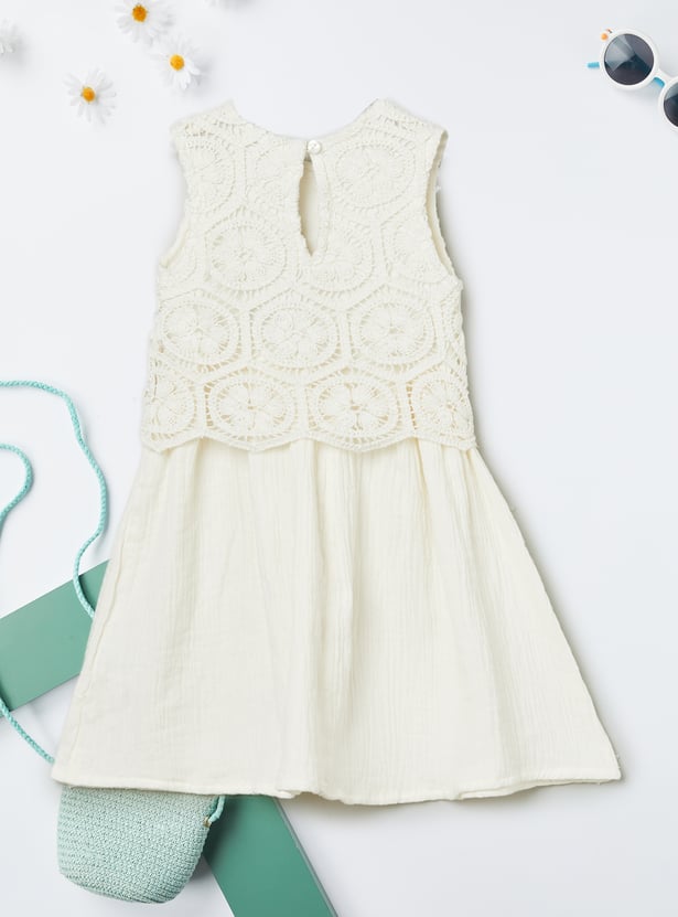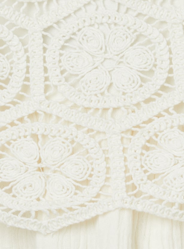 Step into effortless elegance with this crochet dress, designed with a classic round neck and a neat button closure. The sleeveless silhouette and layered look add dimension and charm, while the intricate crochet detailing enhances its feminine appeal.