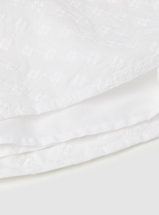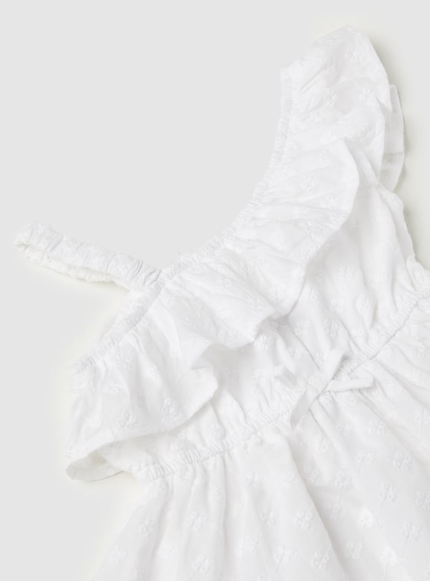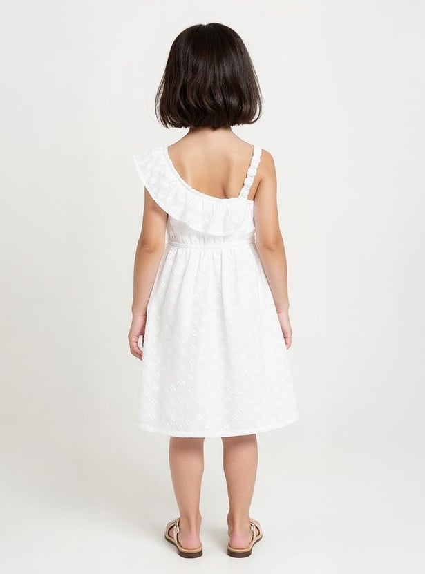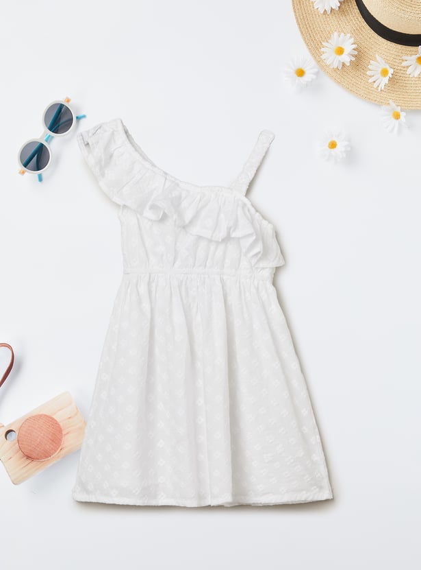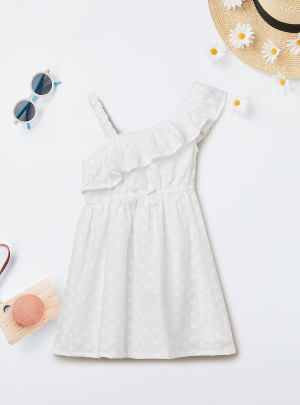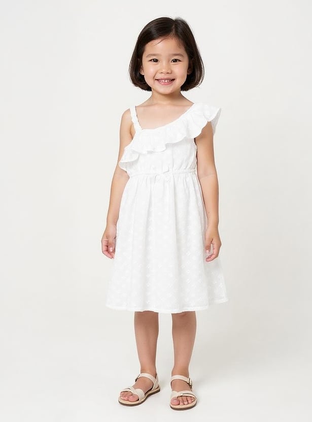 Let her shine in this embroidered A-line dress, designed for effortless elegance. Featuring a one-shoulder strap for a modern twist and a graceful ruffle cascading from the other shoulder, this dress is all about making a statement. The cinched waist enhances the silhouette, while the soft lining ensures comfort, making it perfect for any special occasion.