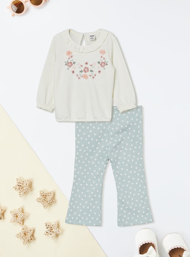 Step out in charming style with this embroidered leggings set. The top features a round neck and full sleeves, paired with flared leggings with an elasticated waist for comfort and ease