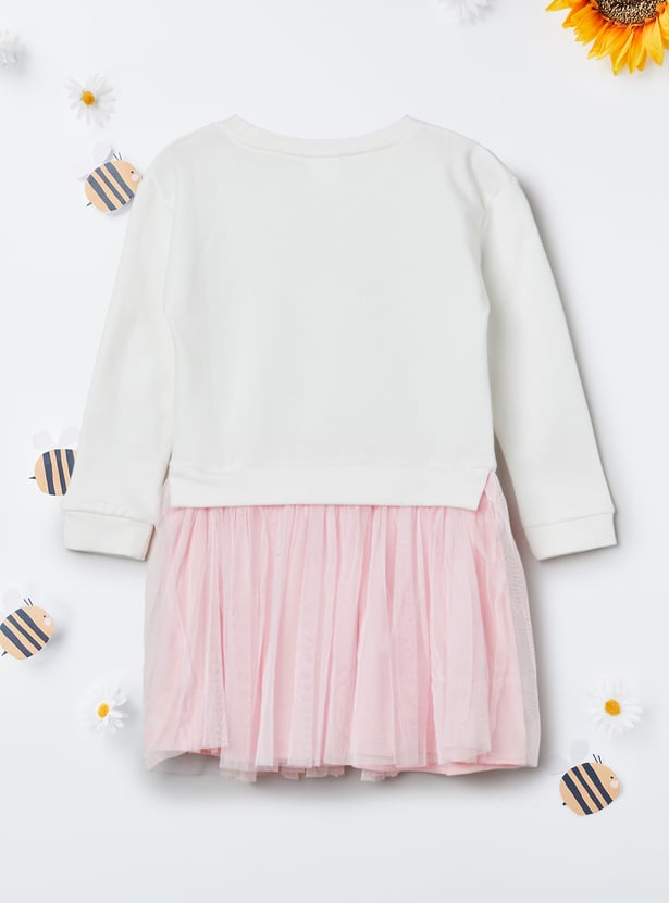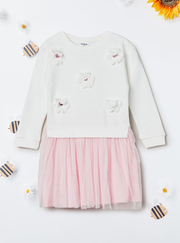Step out in effortless charm with this applique tulle dress. Designed with a classic round neck and full sleeves, it flows into a graceful flared hem that adds movement and femininity to your look. Perfect for day-to-night wear.