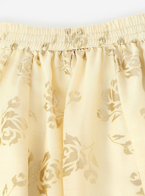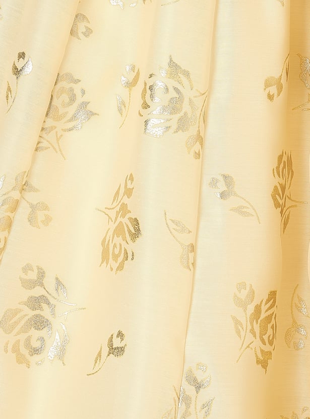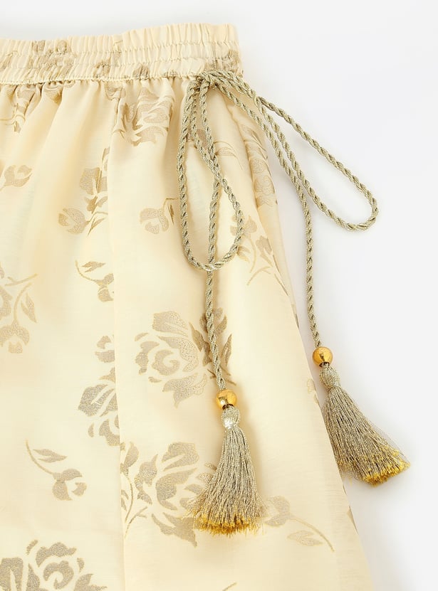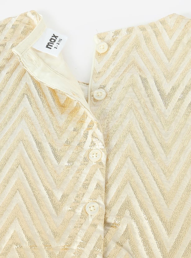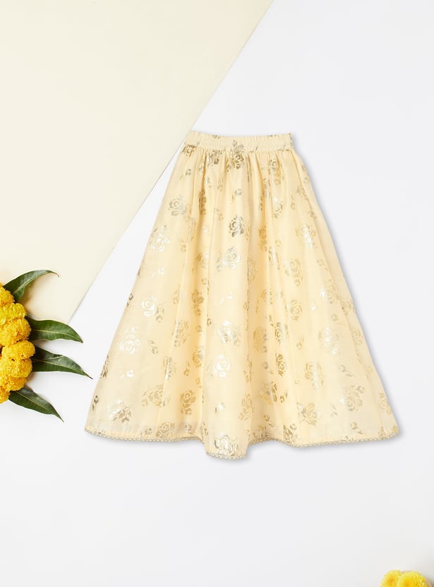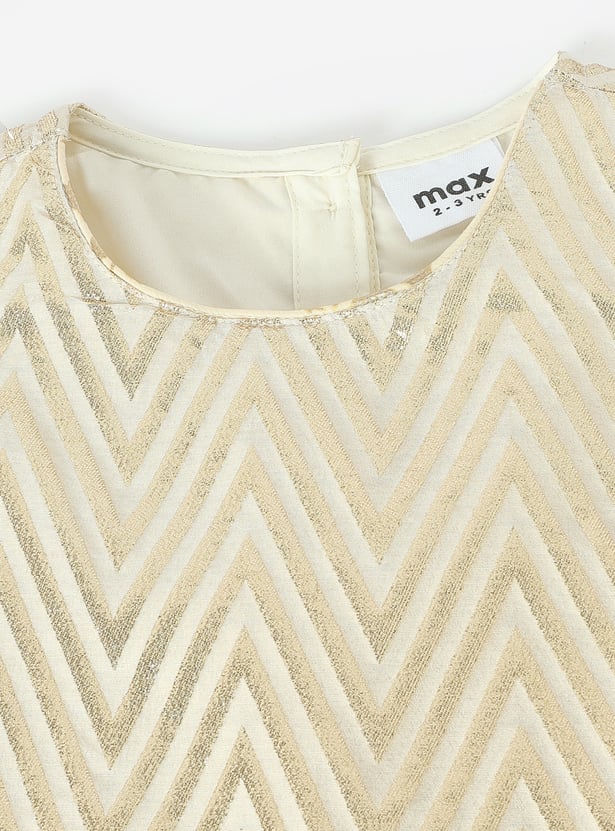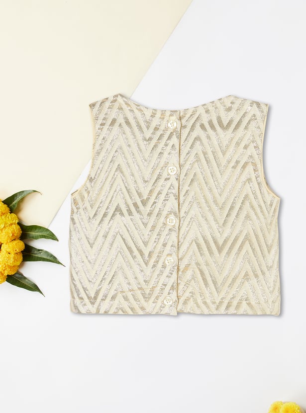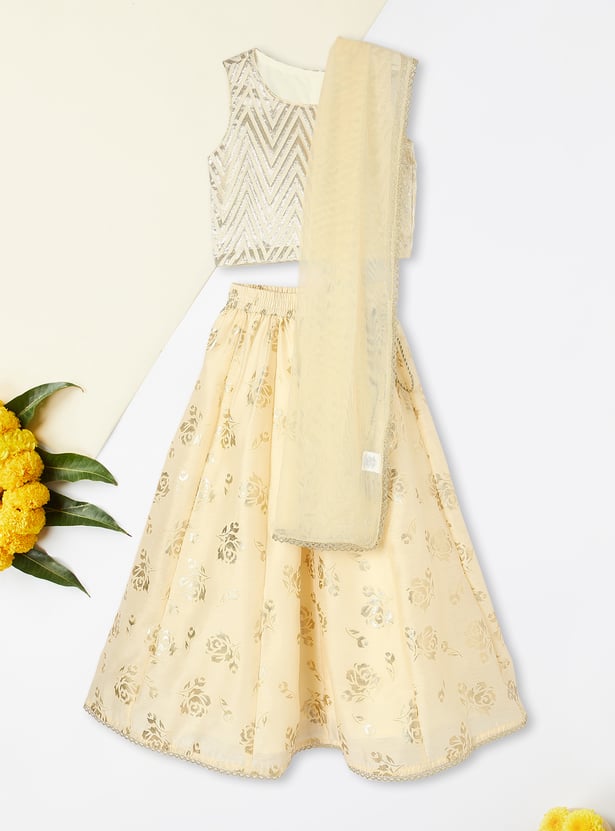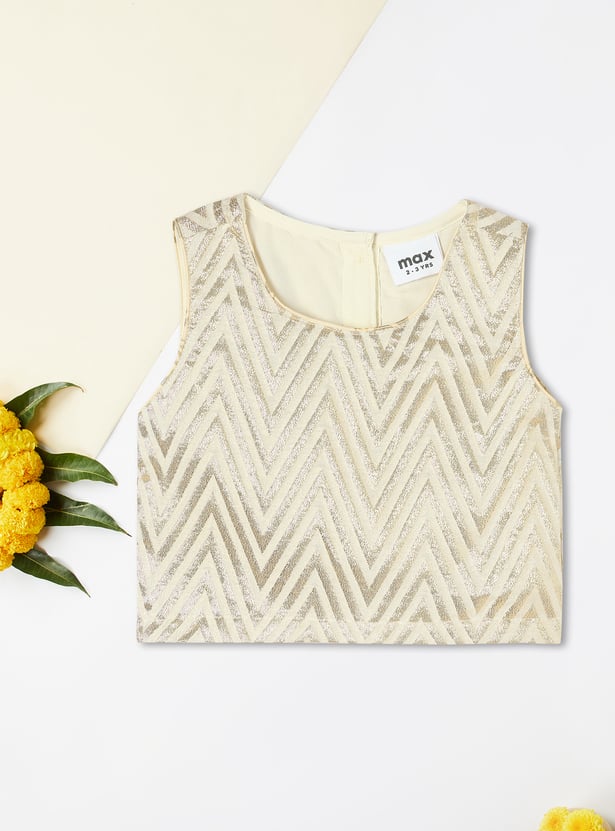 Dress up your little diva with this lehenga set. It features a chevron pattern top with a round neck and sleeveless. It is complemented with a printed lehenga skirt with an elasticated waist, tie-up at the side, and a net dupatta.