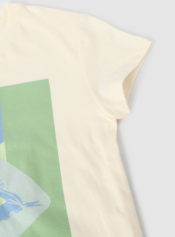 Add a playful edge to your kid's casual wardrobe with this T-shirt. Featuring a vibrant graphic print, a classic round neck, and comfy half sleeves, it's the perfect blend of fun and style.