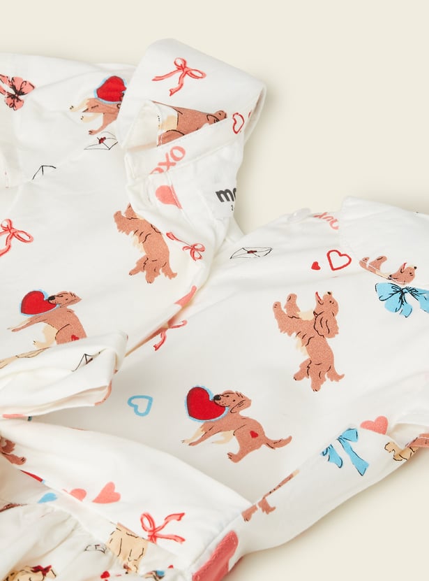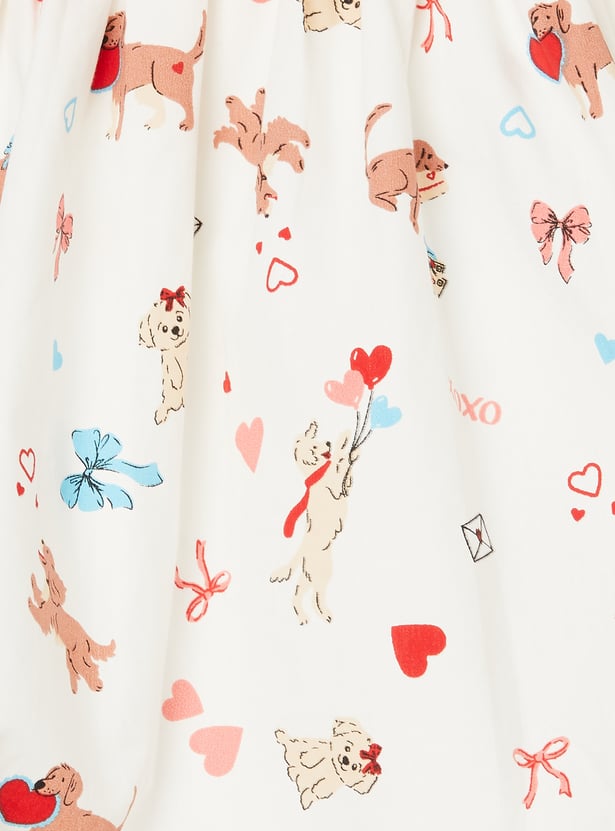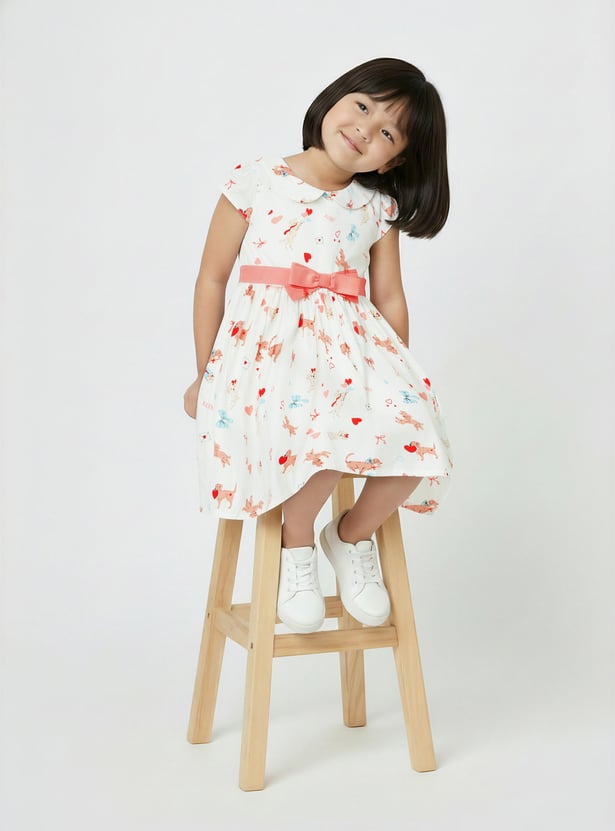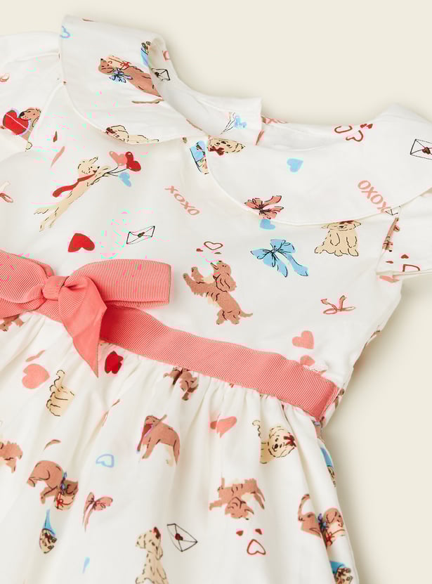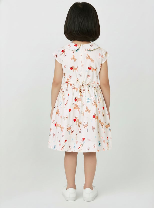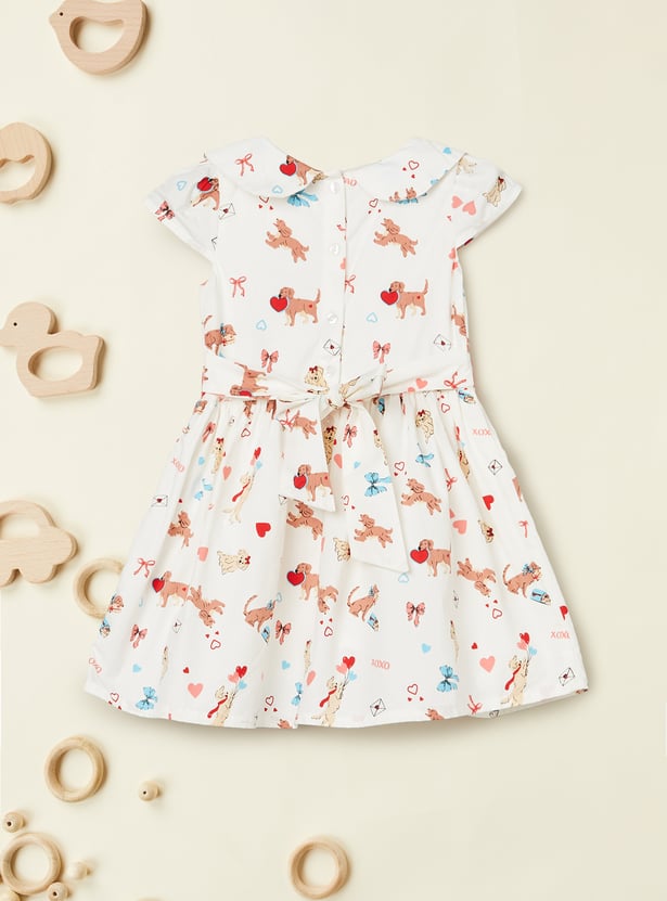 This printed dress features a classic Peter Pan collar, sleeveless design, and a button closure for easy wear. A back tie-up adds a delicate, feminine finish—perfect for twirling through the day.