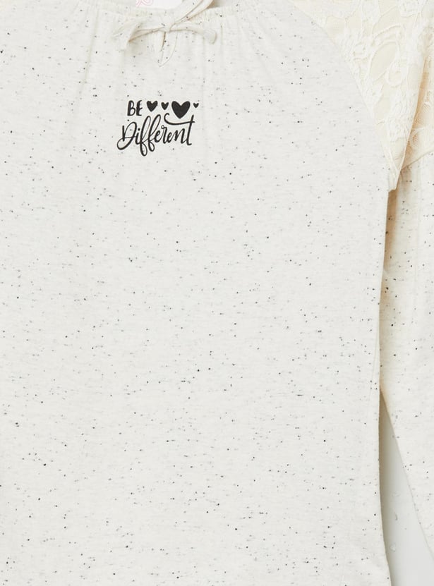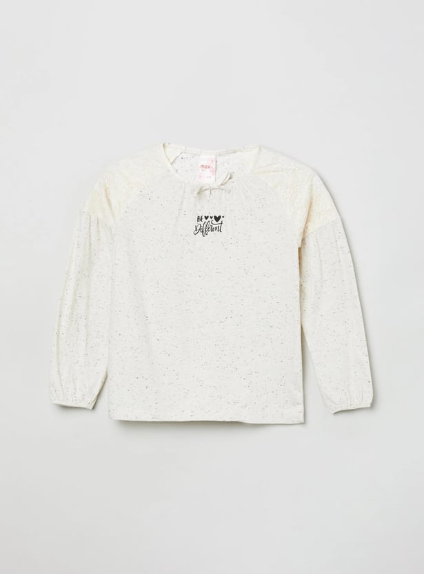 An ideal pick for any occasion, this top is designed with a printed surface with full sleeves, lace detailing, and a tie-up neckline.