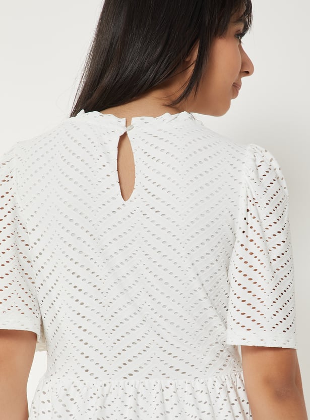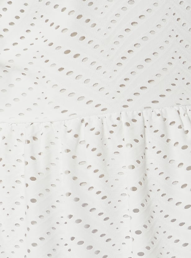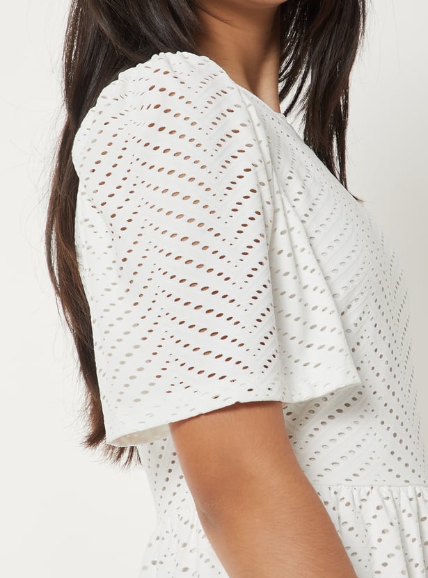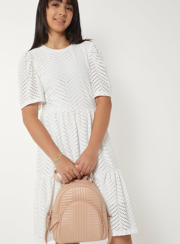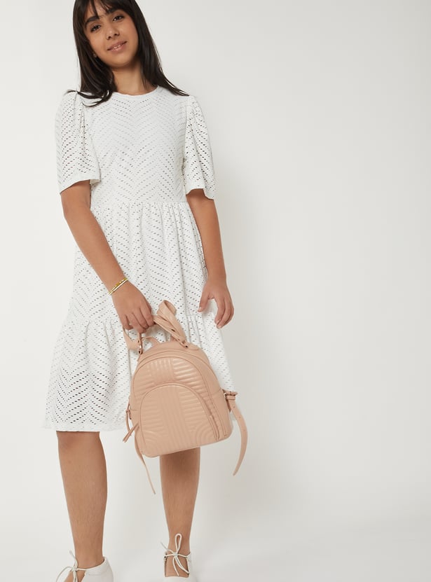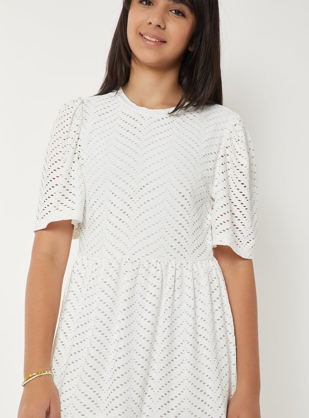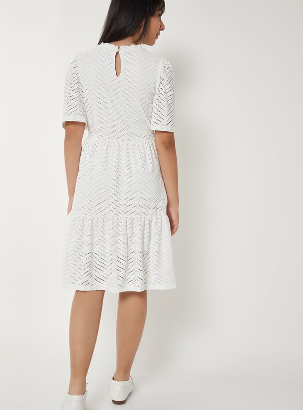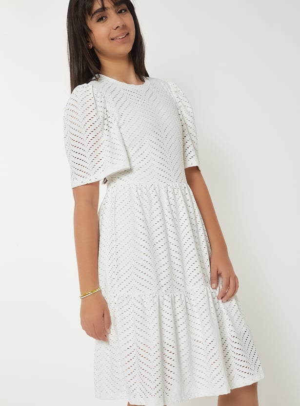 Crafted in breathable fabric with delicate schiffli embroidery, this tiered dress brings effortless elegance to her festive wardrobe. The round neckline and half sleeves offer a classic silhouette, while the soft tiers add volume and movement—perfect for twirling through celebrations.