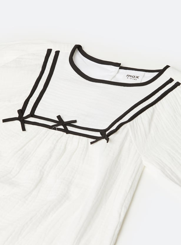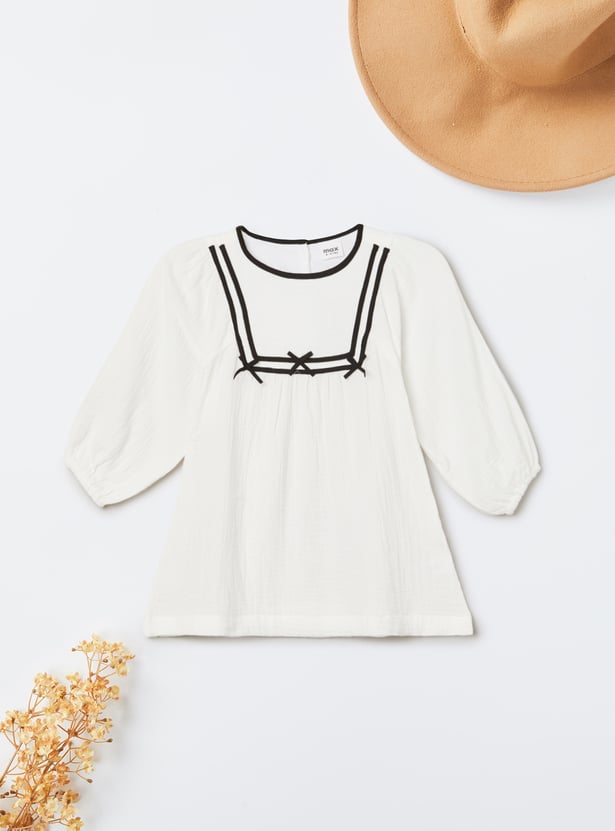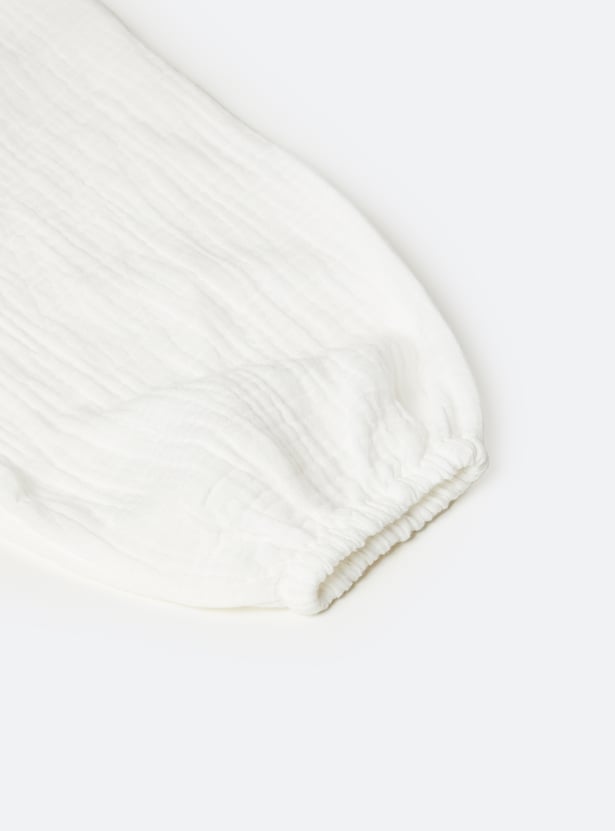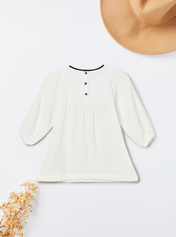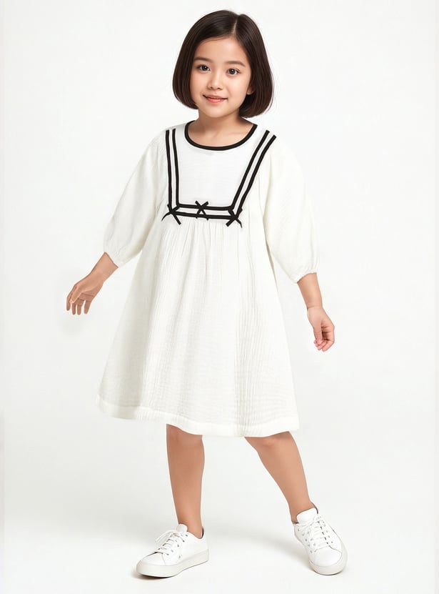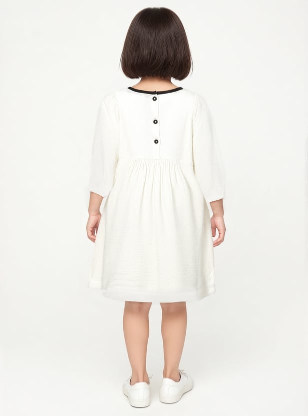 This textured dress features a classic round neck, 3/4th sleeves, and a chic button closure for a refined yet effortless look. The textured fabric adds depth and charm to your everyday style.