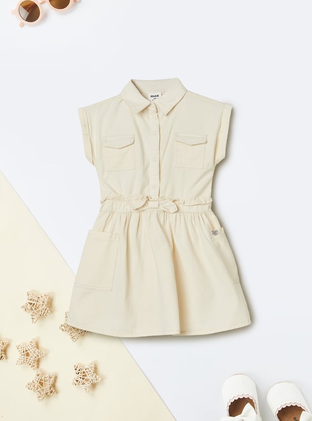Amp up her cuteness with this shirt dress. Styled with a spread collar, extended sleeves, and chest flap pockets. It features a bow accent at the waist and waist patch pockets.