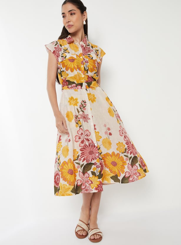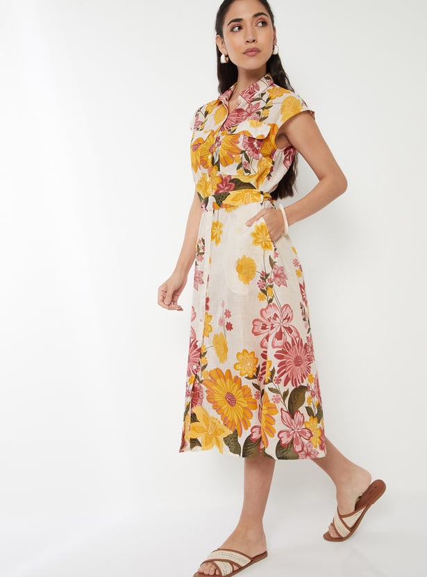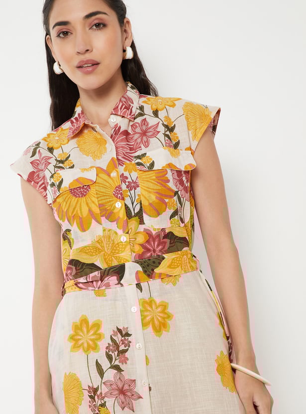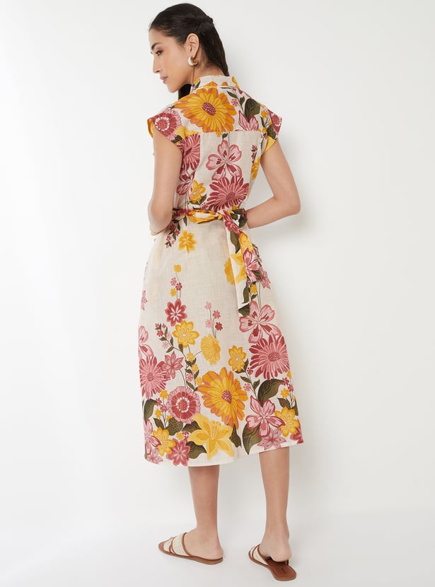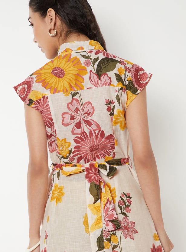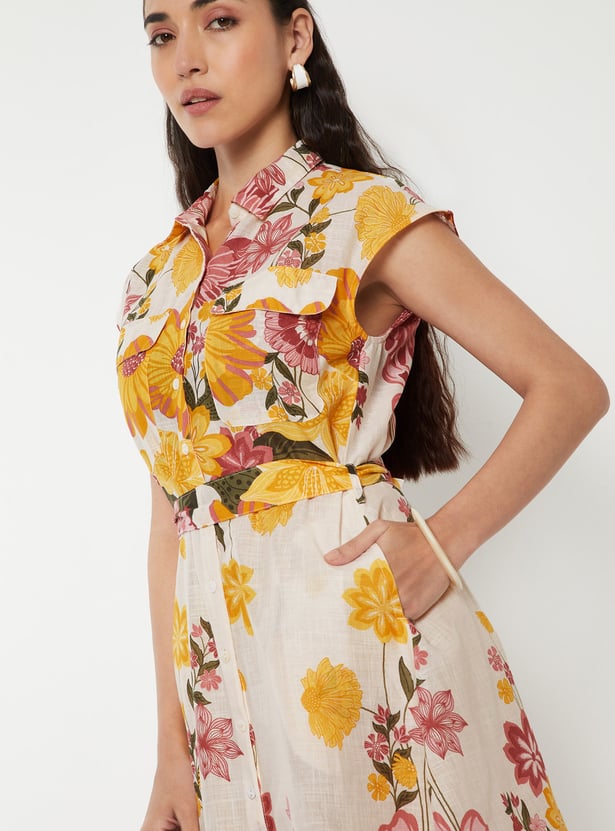 This shirt dress features a collared neck, cap sleeves, and a waist belt. Additionally, it is complemented by a floral printed fabric.
