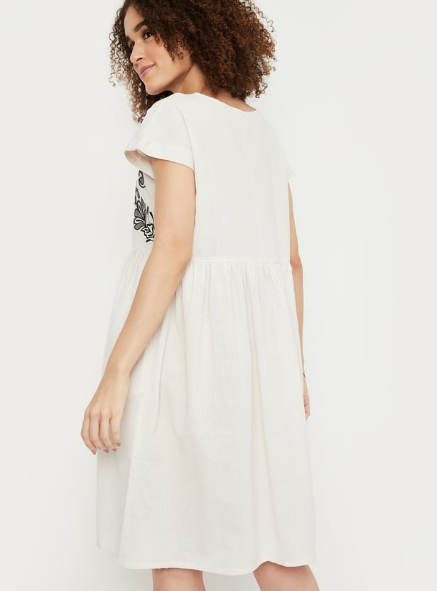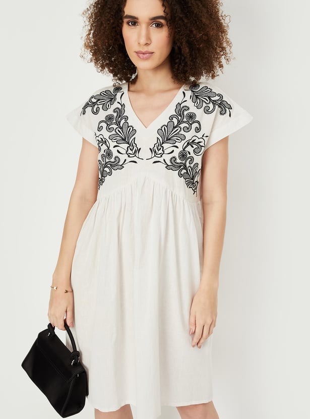 This gorgeous dress, featuring a captivating embroidery design, adds a charming touch to your style. With a delightful v-neckline, extended sleeves with gathered detailing, and an A-line silhouette, it offers a perfect blend of elegance and comfort.