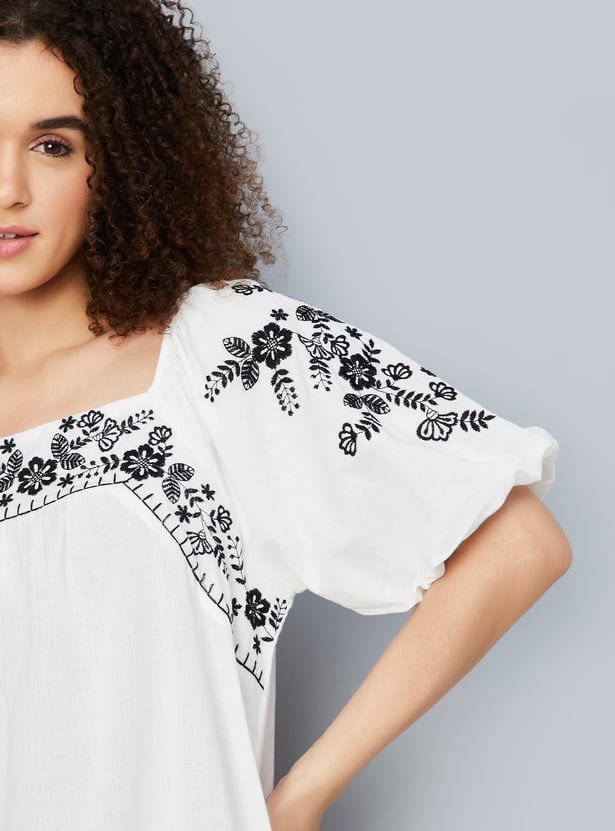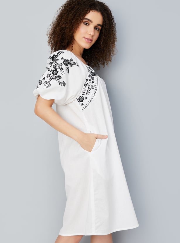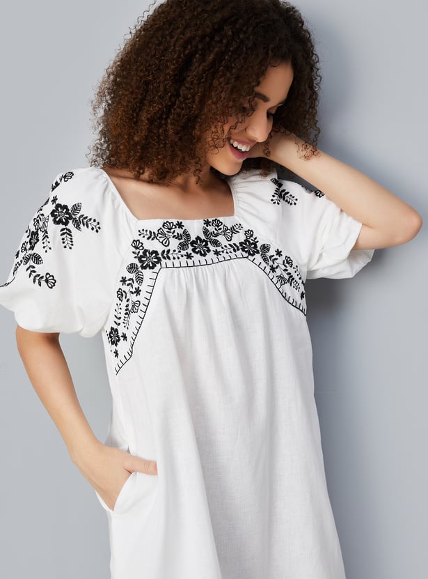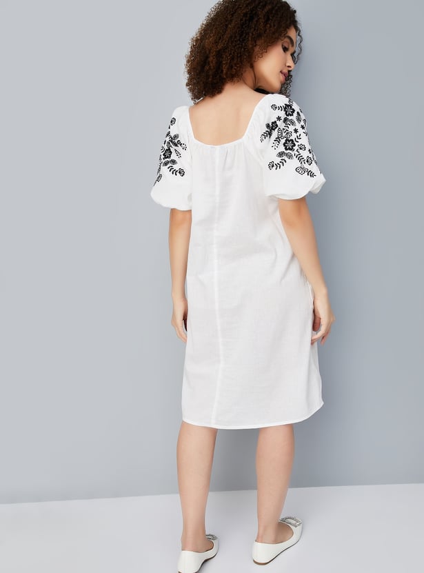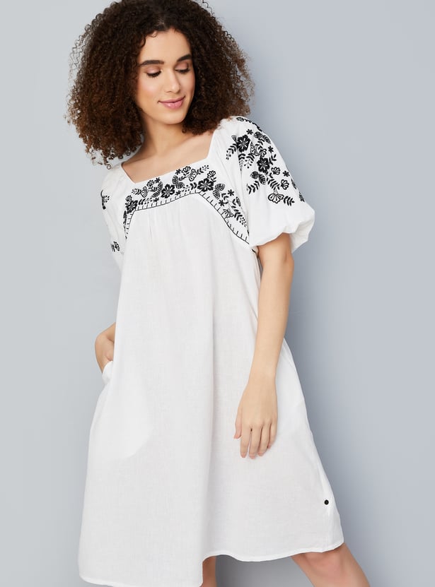 Make a statement with this beautiful embroidered A-line dress. Featuring a playful square neckline and charming balloon sleeves, it effortlessly combines elegance and style. The intricate embroidery adds sophistication, while the flattering A-line silhouette and functional pockets complete the look.
