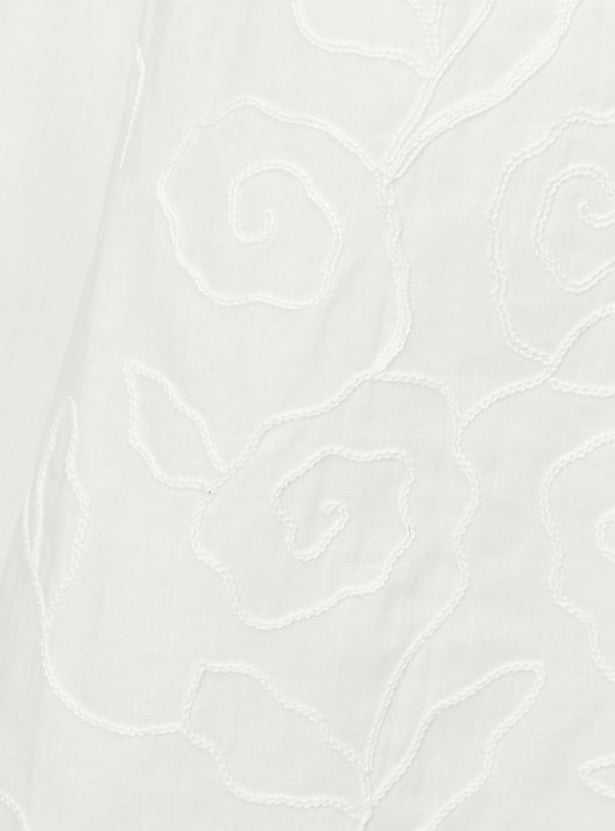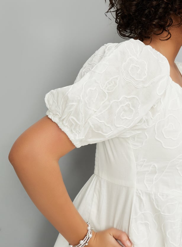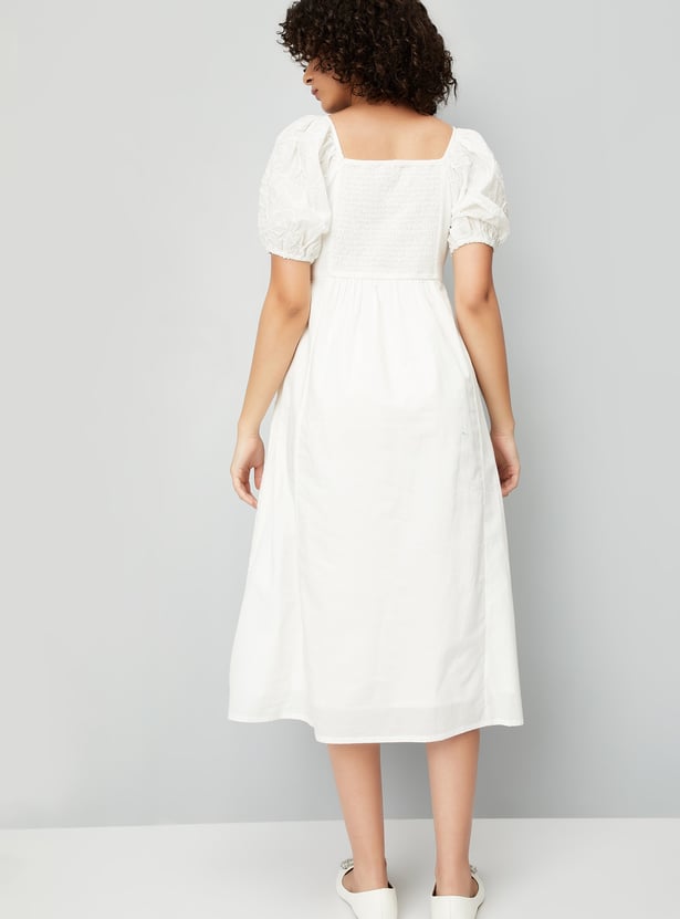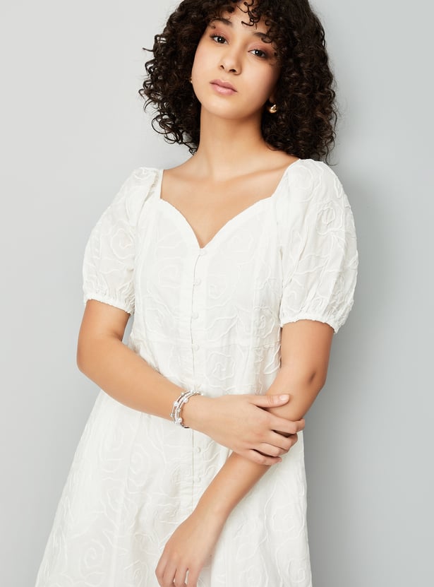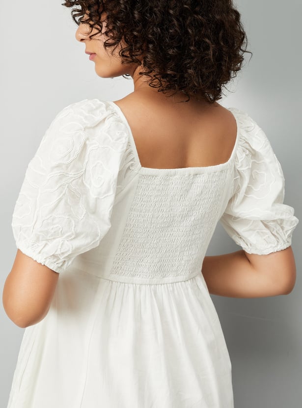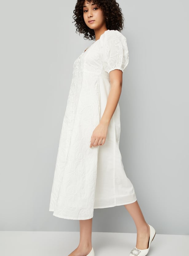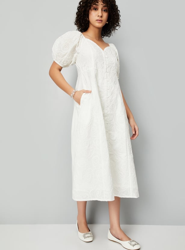 Add a feminine touch to your wardrobe with this embroidered dress, featuring a flattering neckline and half-puffed sleeves. The delicate embroidery adds charm and elegance to the design.