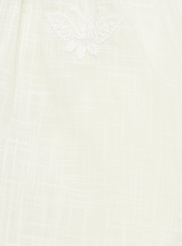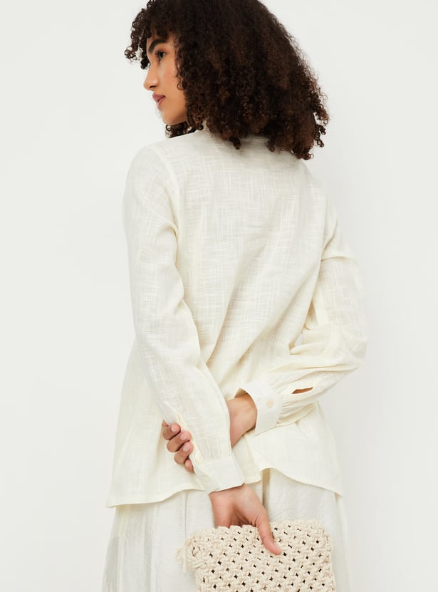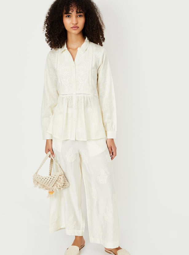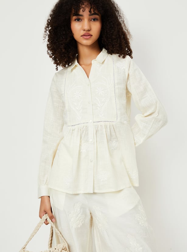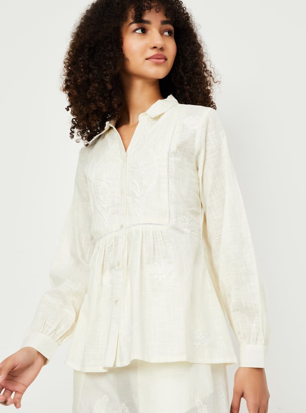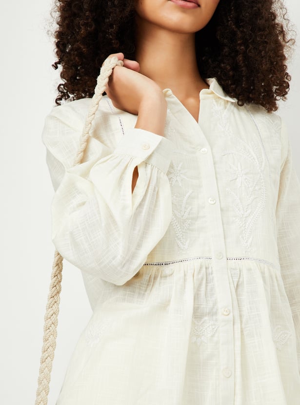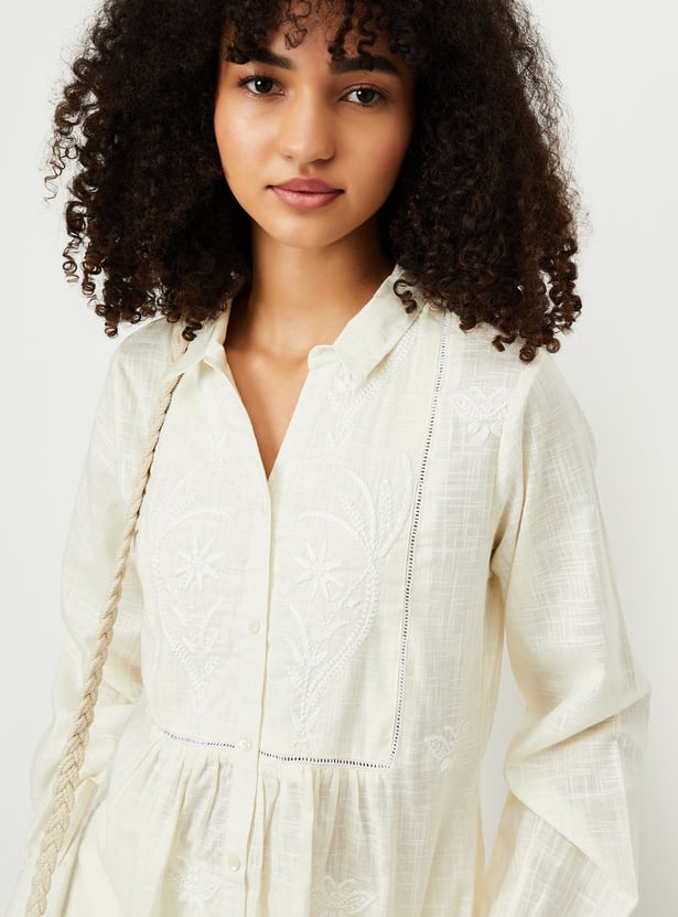 This embroidered A-line tunic exudes elegance with its intricate detailing, spread collar, and button placket. The full sleeves with button cuffs complete the classic, refined look, making it perfect for both casual and dressy occasions.