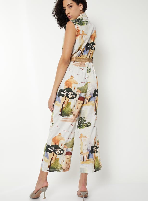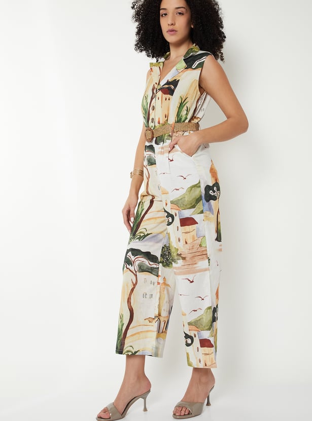 Step into effortless style with this printed jumpsuit designed for modern comfort. Featuring collared neckline, overlapped pleat detailing, sleeveless silhouette, and side pockets, it offers a chic yet relaxed fit.