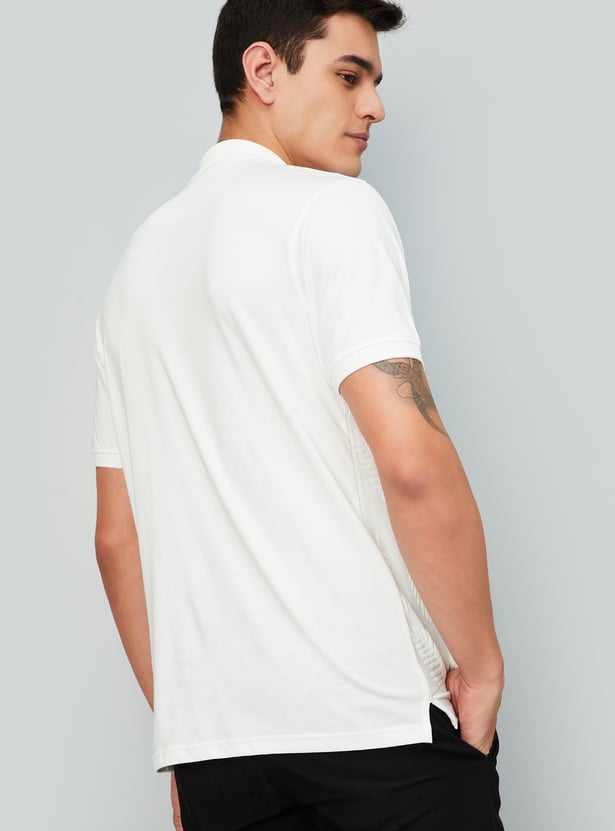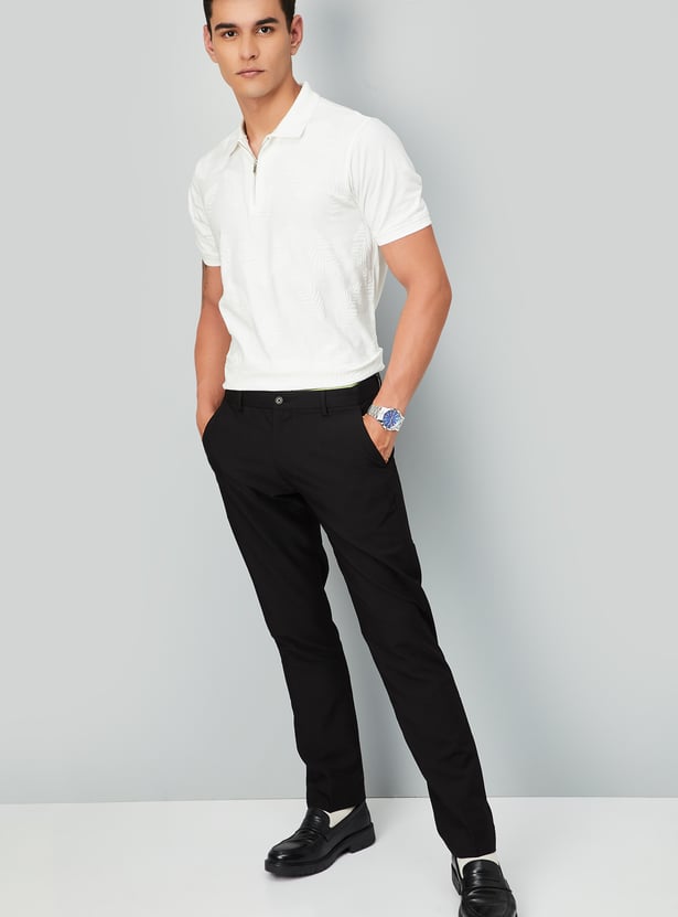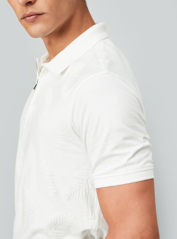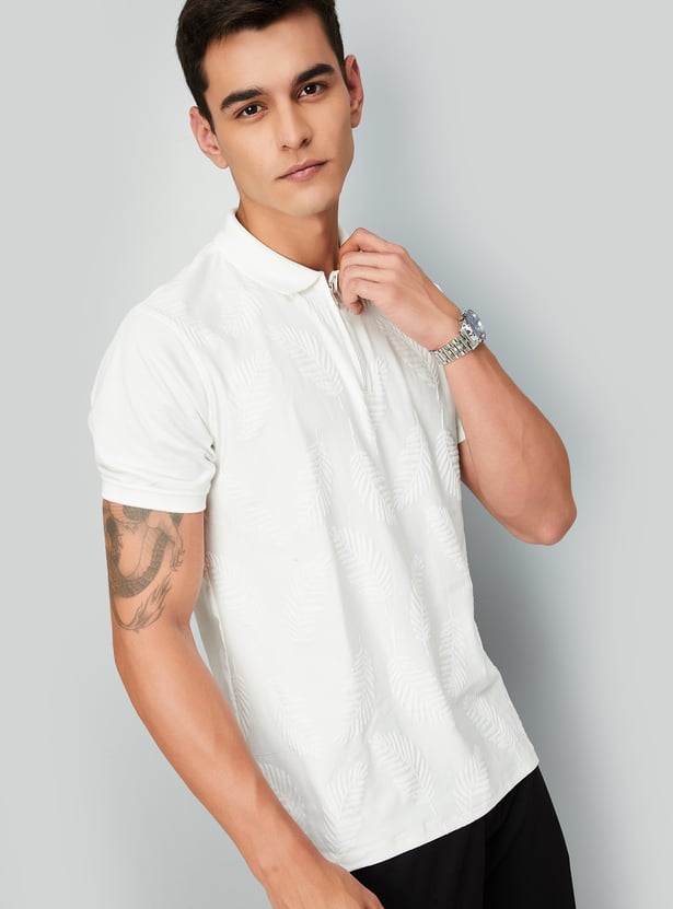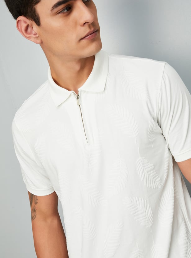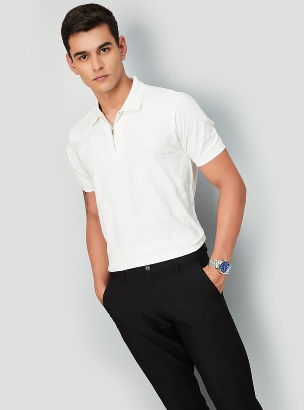 Upgrade your casual wardrobe with this T-shirt. The subtle jacquard pattern adds texture and sophistication to your look. This polo tee is designed with a polo collar, half sleeves, and a zip placket. Ribbed cuffs and slit hem complete the look.