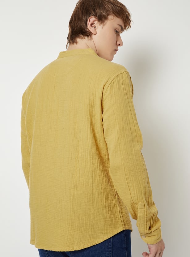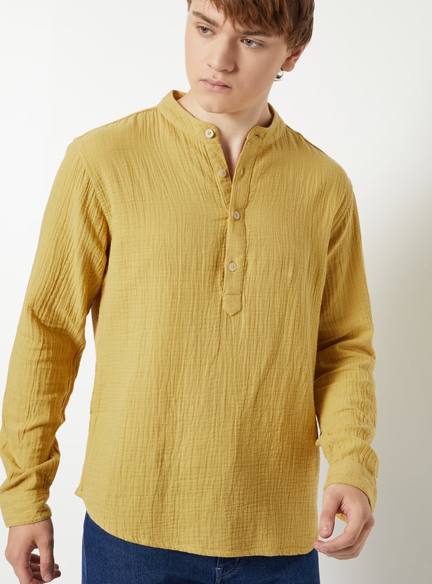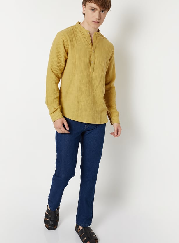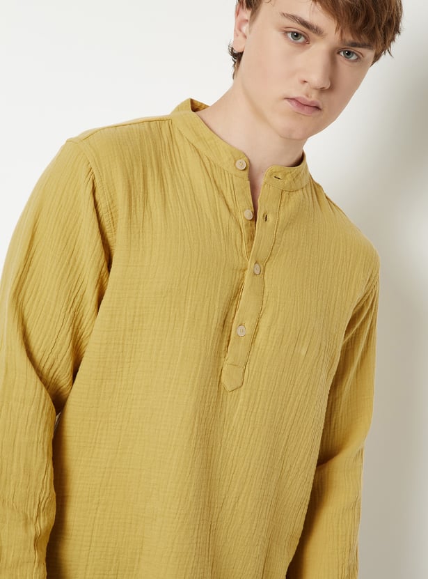 Elevate your ethnic wardrobe with this textured slim fit short kurta, featuring a band collar, full sleeves, and button cuffs for a refined finish.
