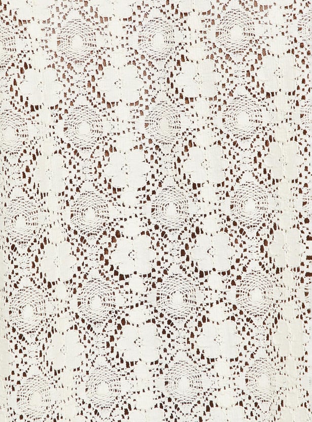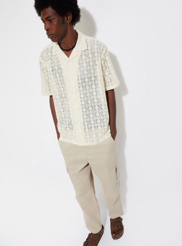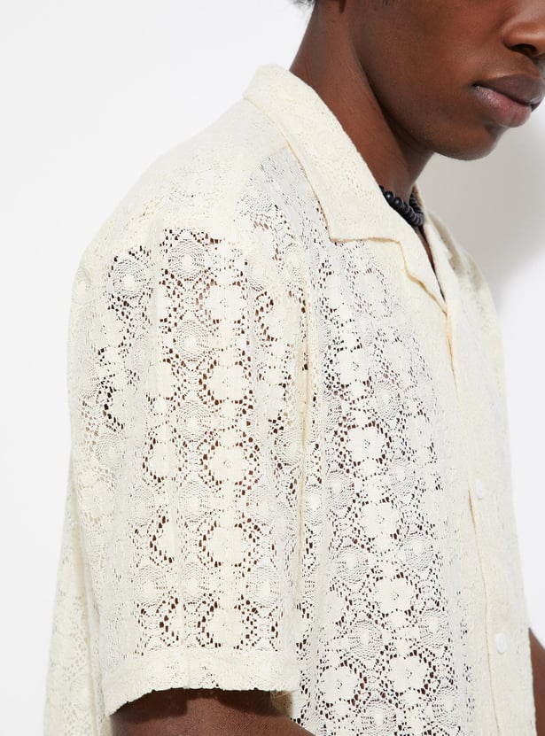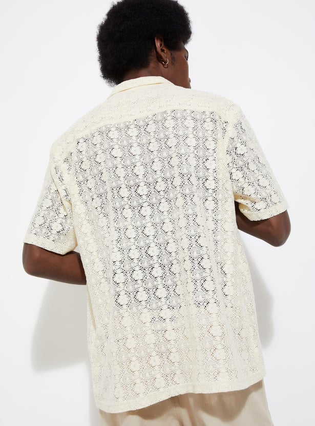 Exude vacation vibes with this shirt featuring a lace design. It is styled with a resort collar, half sleeves, and a front button placket. This shirt is crafted in an oversized profile for a roomy fit.