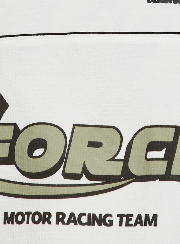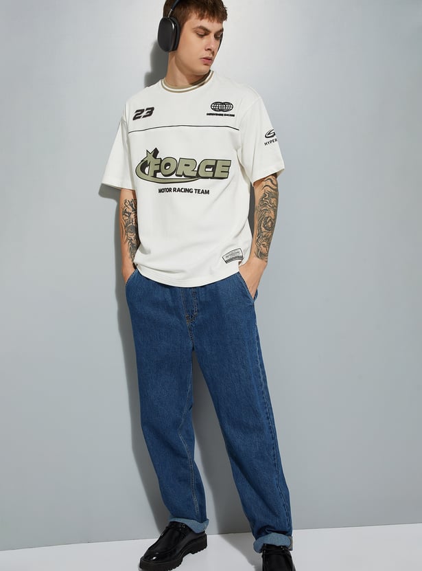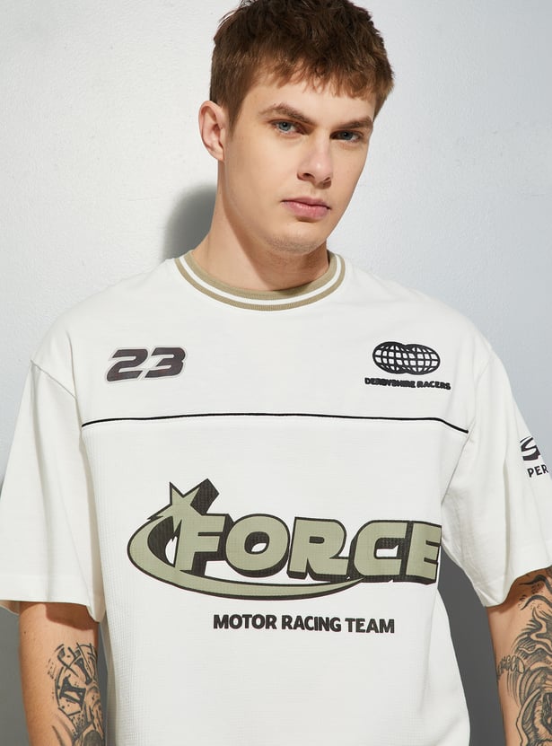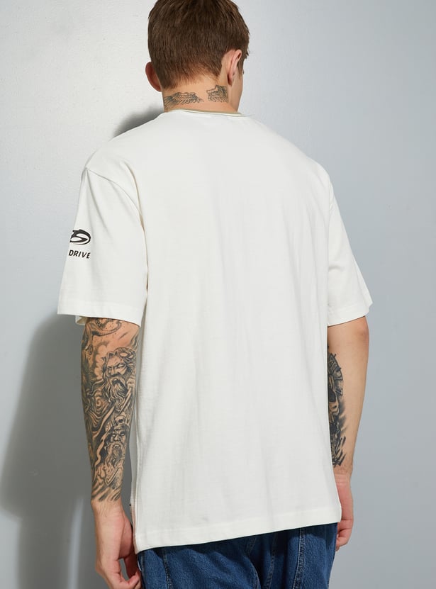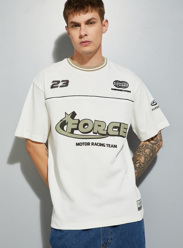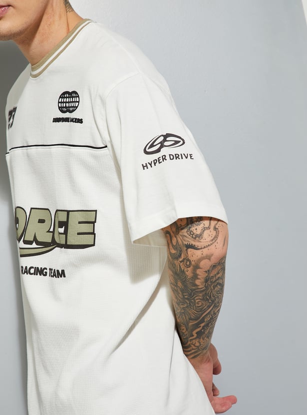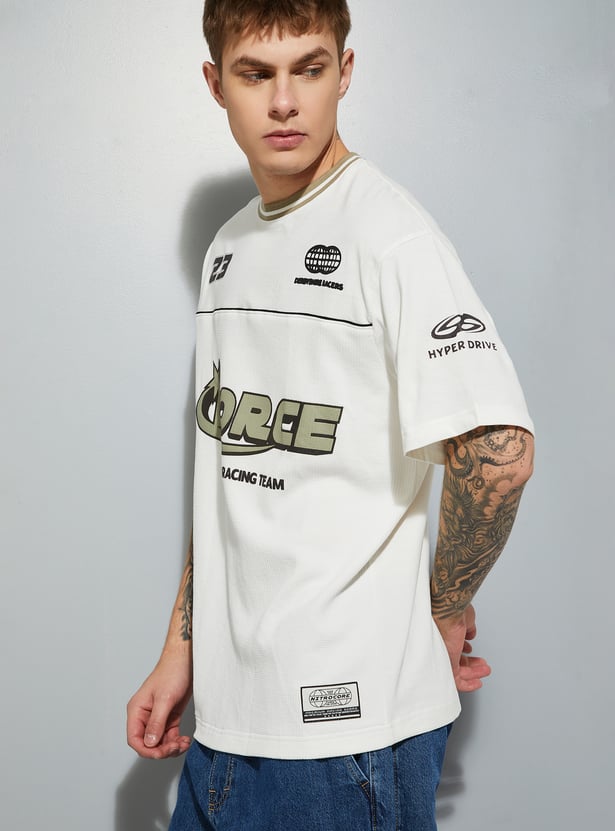 Stand out in laid-back style with this T-shirt. Designed with a striped crew neck, drop shoulders, and comfortable half sleeves, it features an oversized fit for an easy, casual vibe. The placement print adds a bold, standout touch to the look.