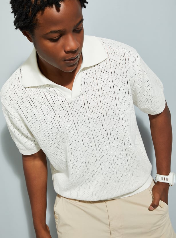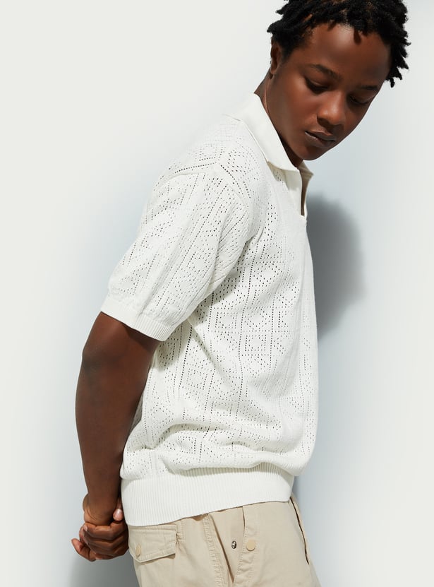 Rock your casual game with this T-shirt, crafted for the ultimate street style. Featuring a sharp Johnny collar, short sleeves, and ribbed trim, it's got the classic vibes nailed down. The pointelle knit design takes it to the next level, adding an edgy twist to your laid-back look.