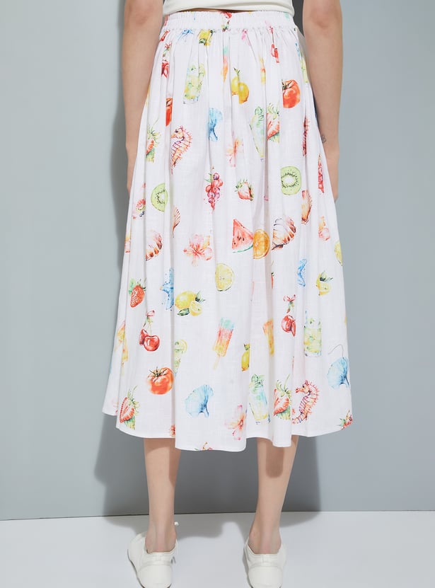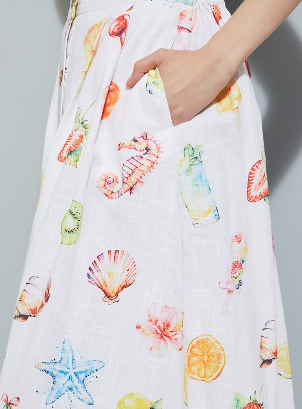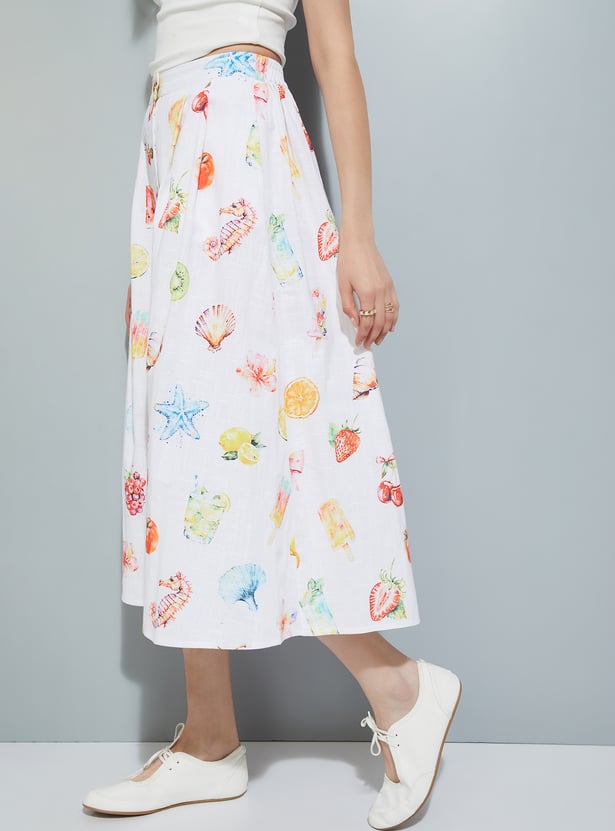 Add a playful swing to your step with this printed flared midi skirt, designed with a comfortable button closure and a flowy silhouette that moves with you. The vibrant print brings effortless charm to any look.