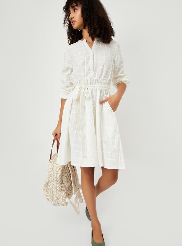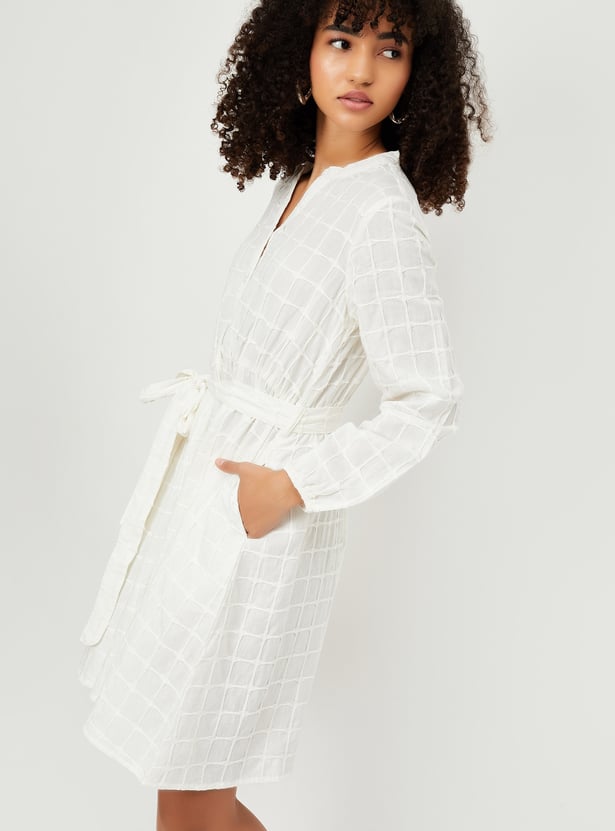 This stylish checked A-line dress features a mandarin collar, full sleeves, and side pockets for both practicality and flair. The belted waist adds a flattering silhouette, making it a perfect choice for both casual and semi-formal occasions.