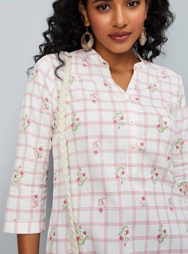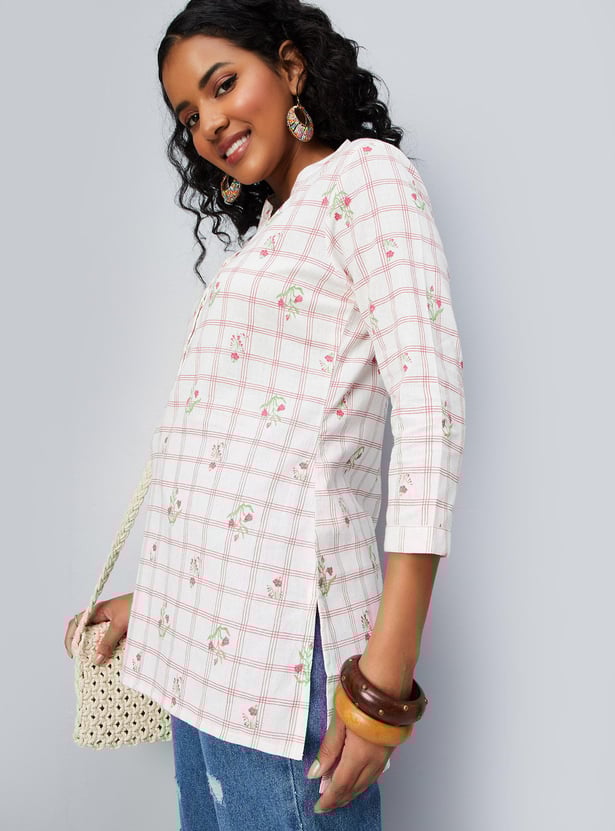 Refresh your casual wardrobe with this short kurti. It features a band collar with a button placket, three-quarter sleeves and a straight hem.