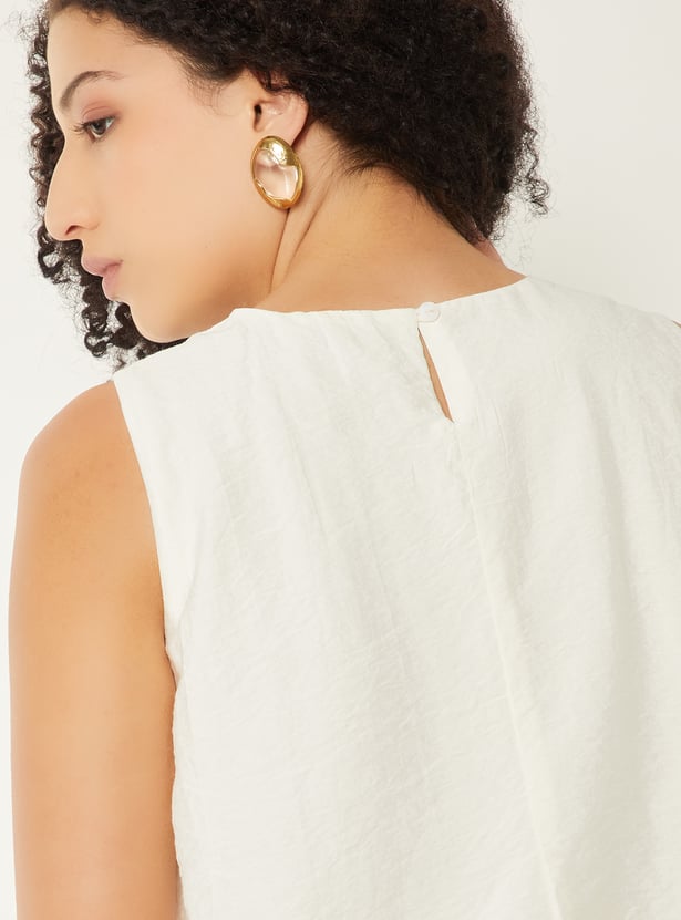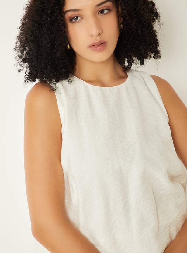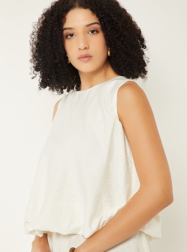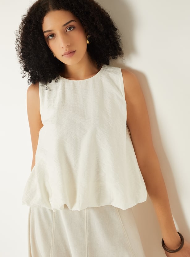 Add a playful twist to your wardrobe with this crinkled bubble hem top, featuring a round neck and sleeveless design. The bubble hem silhouette brings a chic, modern edge while keeping it effortlessly comfortable for casual outings or layered looks.