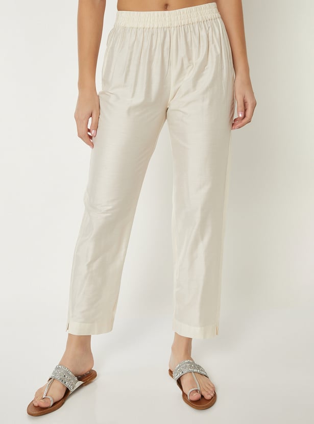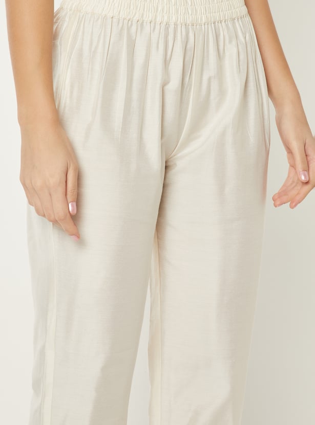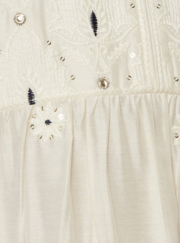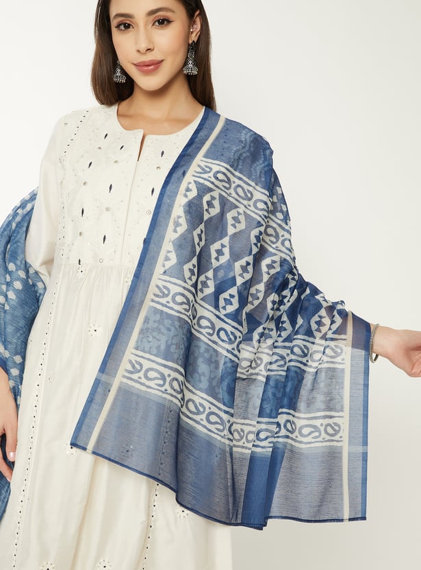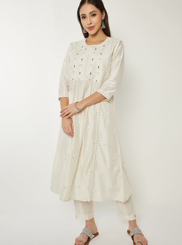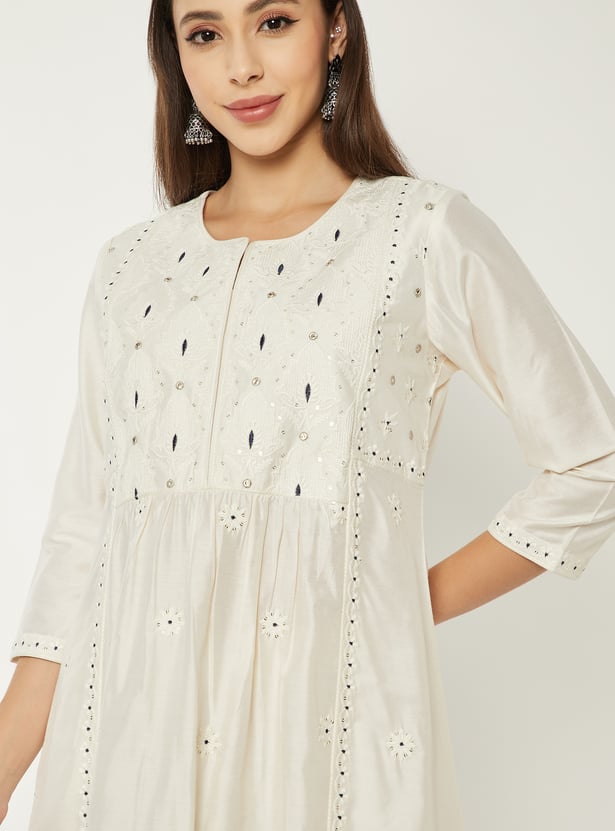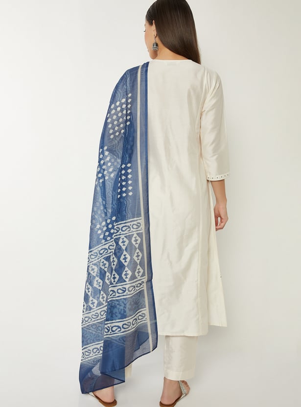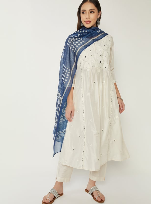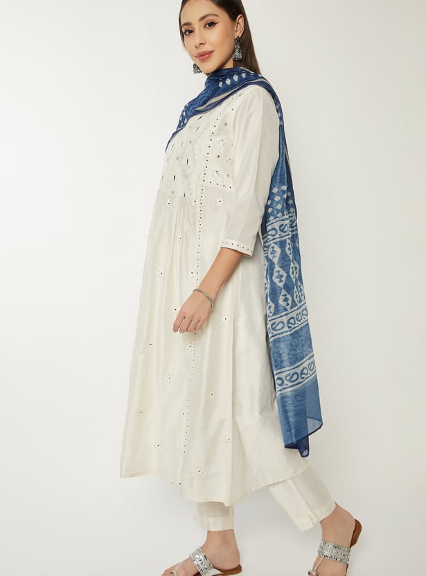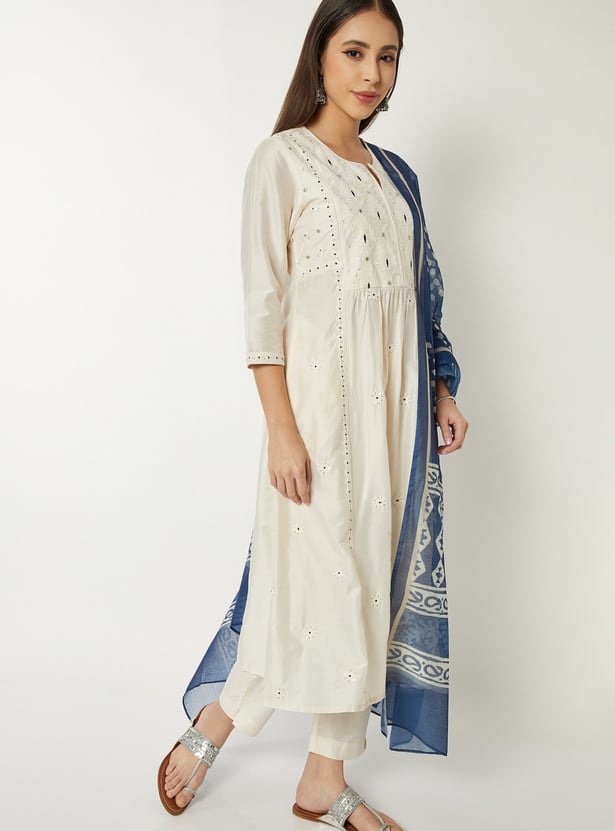 Elevate your ethnic wardrobe with this embroidered kurta set designed for everyday elegance. Featuring an A-line kurta with a notch neck, 3/4th sleeves, side pockets, straight pants with elasticated waist, and a contrast printed dupatta.