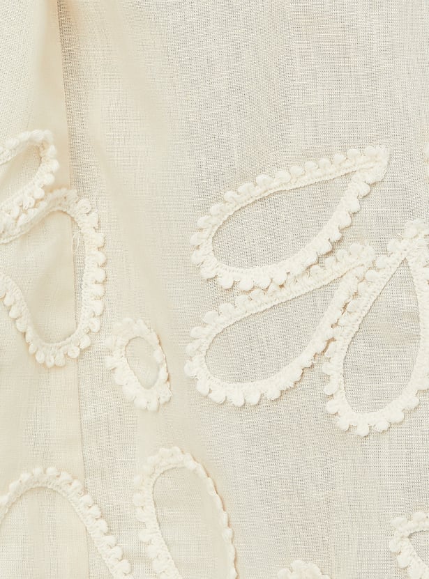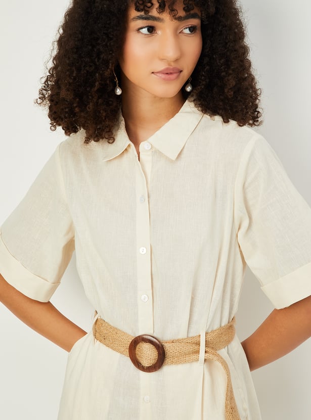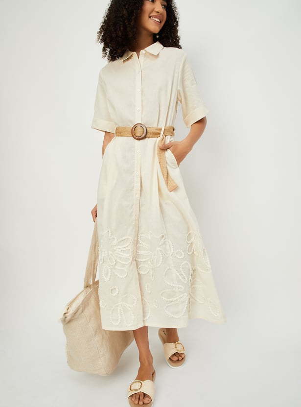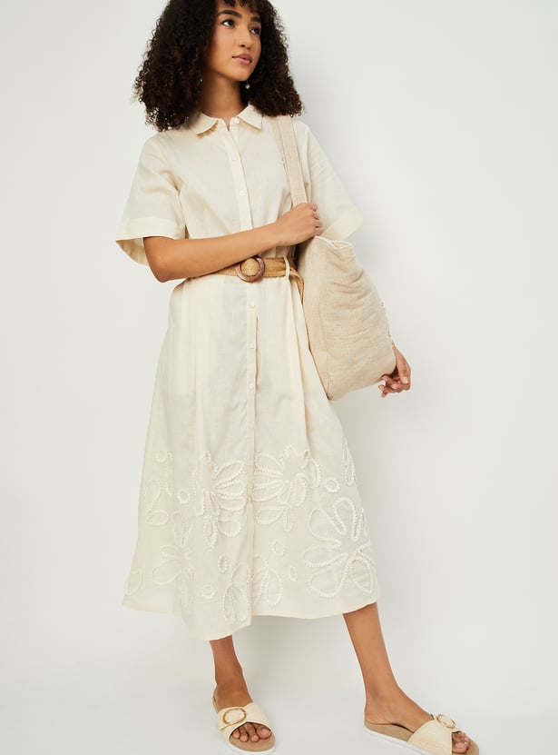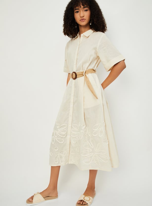 Elevate your everyday style with this embroidered belted midi dress, designed to blend classic details with feminine charm. It features a smart spread collar, a full button placket, and comfortable half sleeves. The delicate embroidery adds texture and visual interest