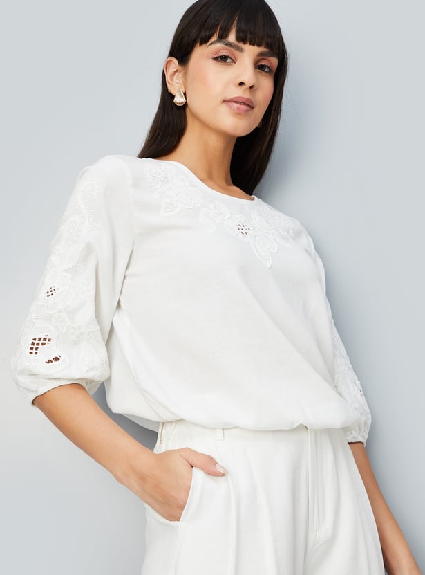 Add a touch of charm to your wardrobe with this embroidered blouse, featuring delicate detailing, a flattering round neck, and playful puff sleeves. Perfect for elevating everyday looks with a hint of elegance.