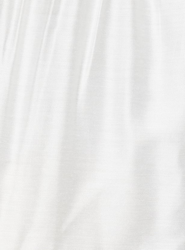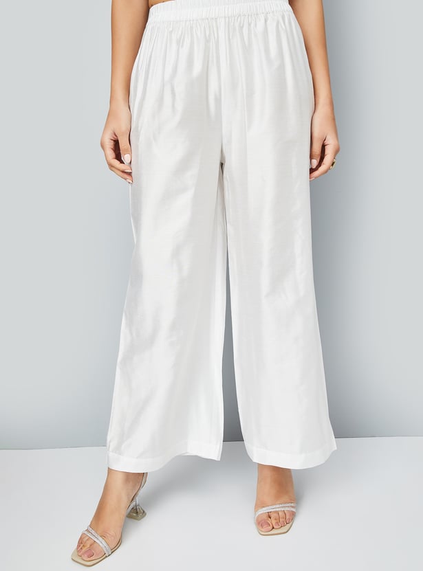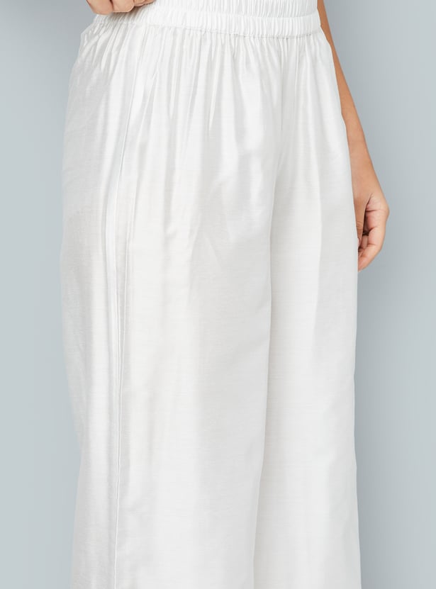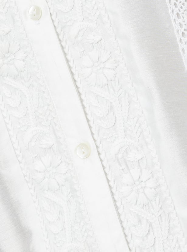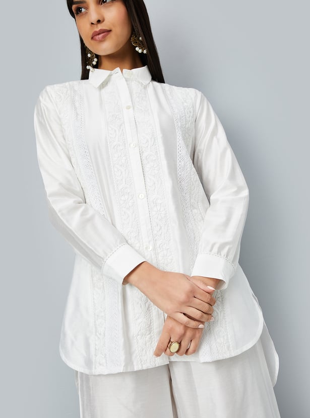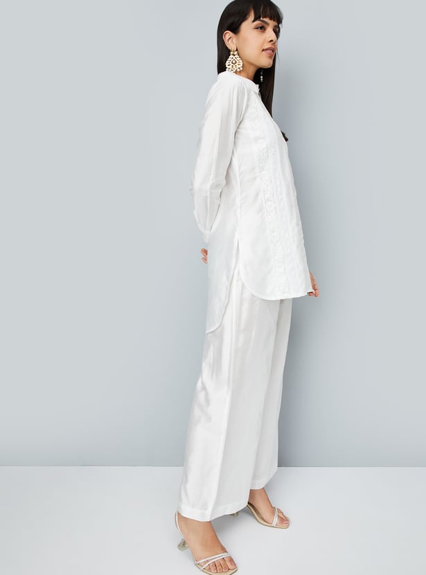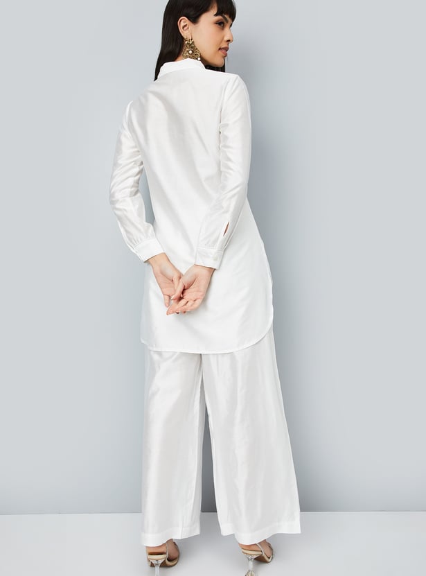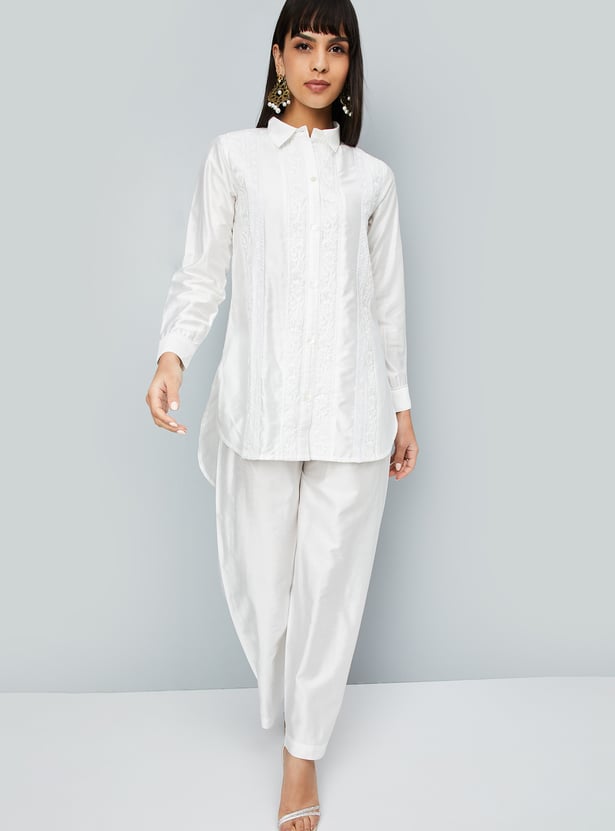 This embroidered co-ords set exudes effortless style. The embroidered tunic features a spread collar, button placket, and full sleeves with button cuffs. It’s paired with elasticated waist palazzos, offering a comfortable and chic fit. The addition of a side pocket adds functionality to this elegant set.