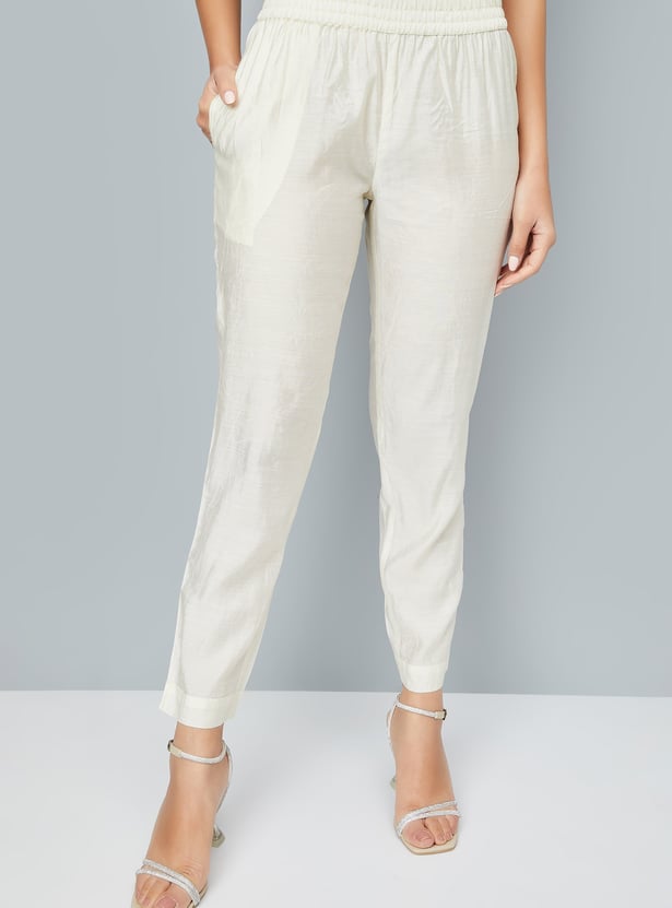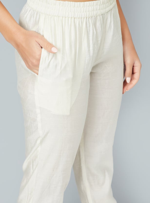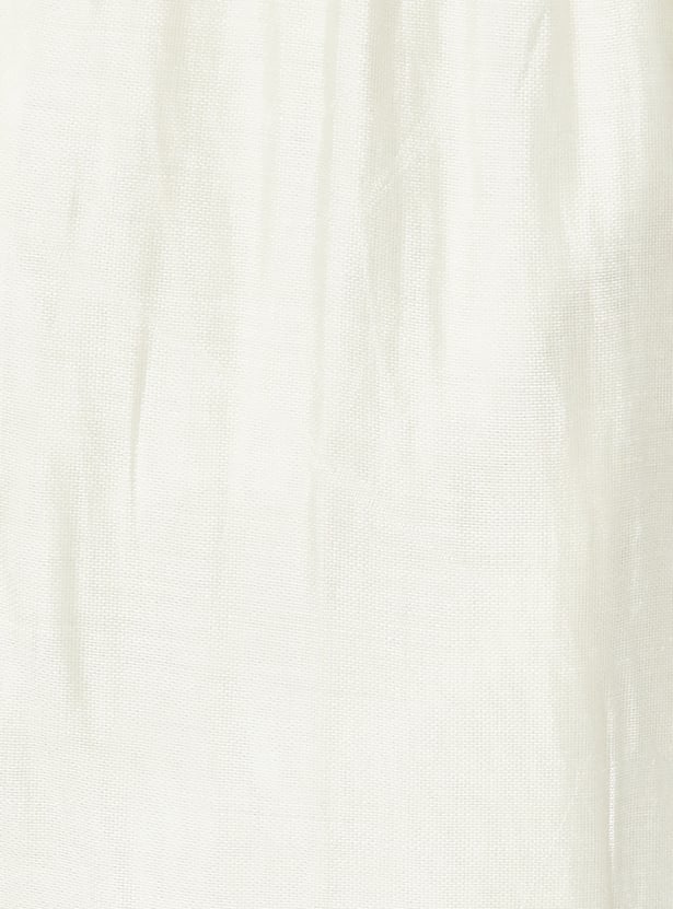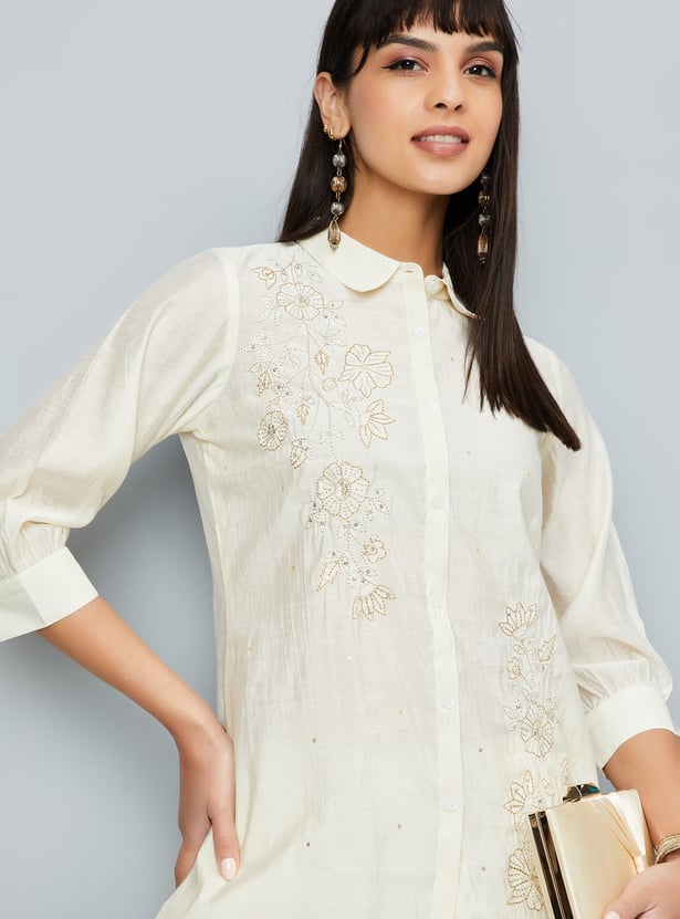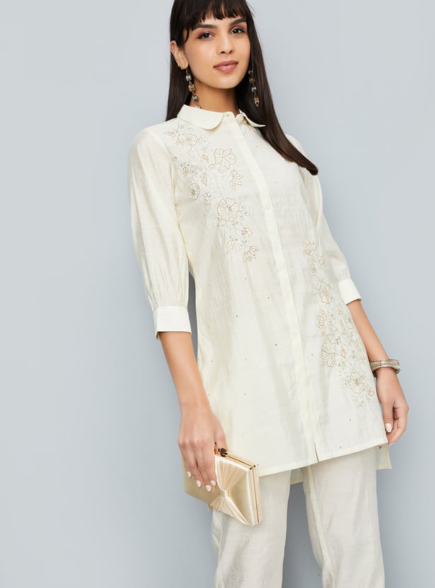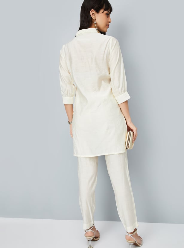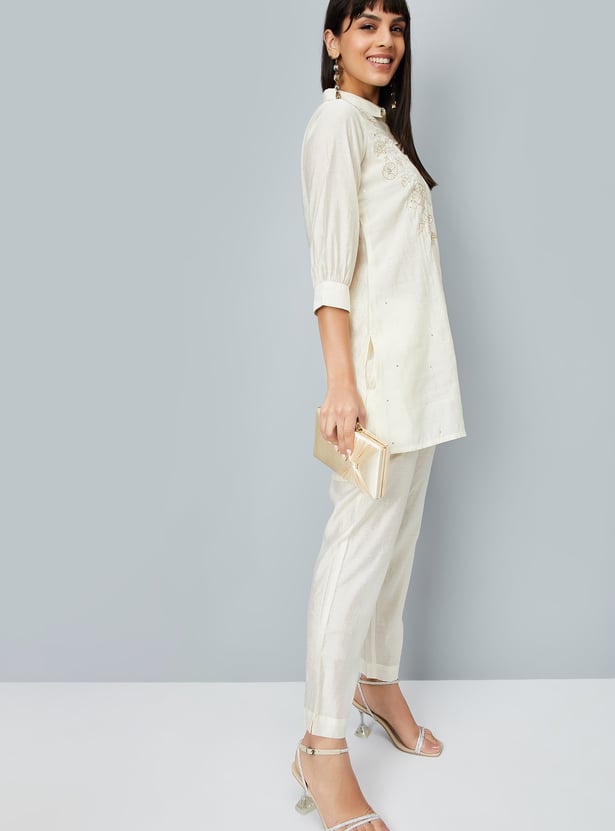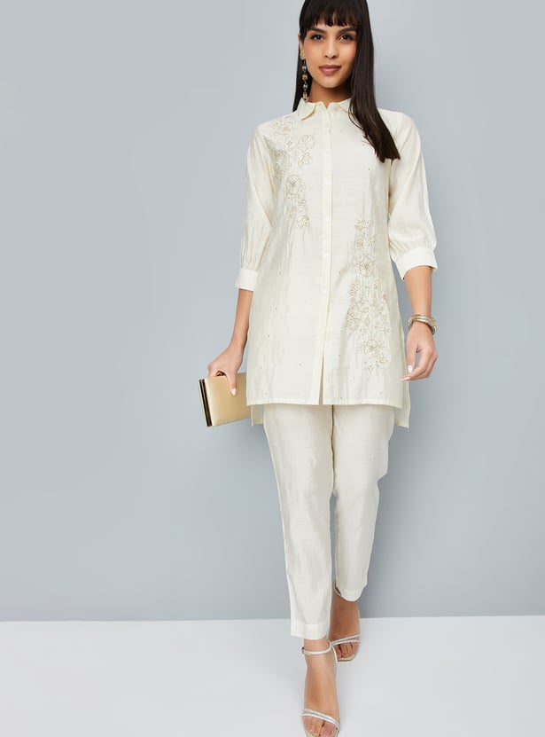 This embroidered co-ords set features a stylish tunic with intricate embroidery, a spread collar, side pocket, and a button placket. The 3/4th sleeves add a chic touch, while the elasticated waist trousers offer comfort and a flattering fit.