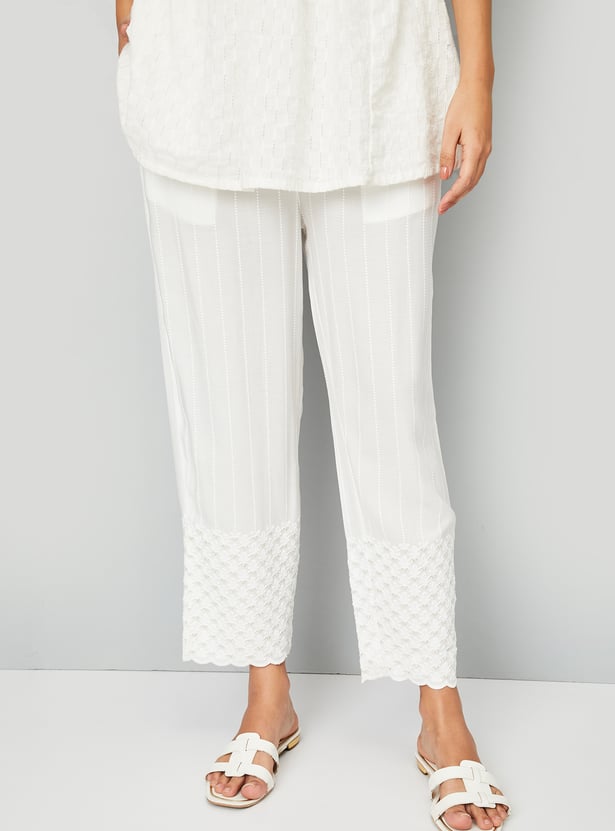 Add a touch of elegance to your everyday wardrobe with these straight pants, featuring mid-rise, delicate embroidery at the hem, a comfortable elasticated waistband, and practical side pockets.