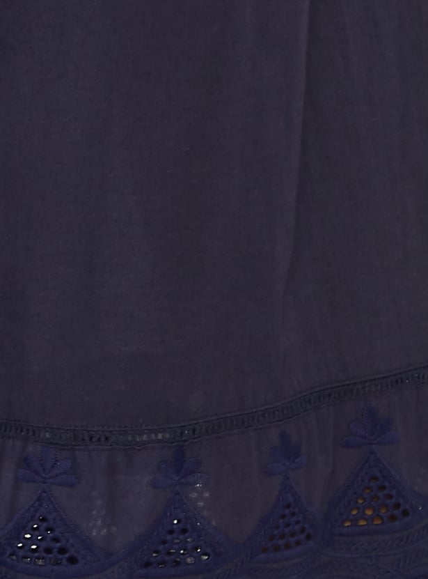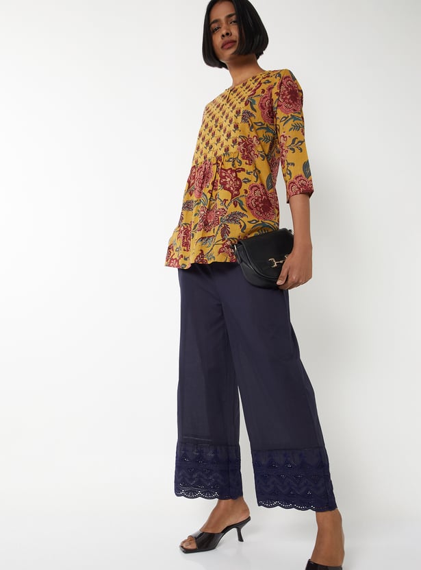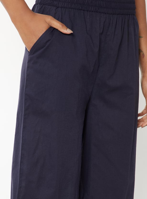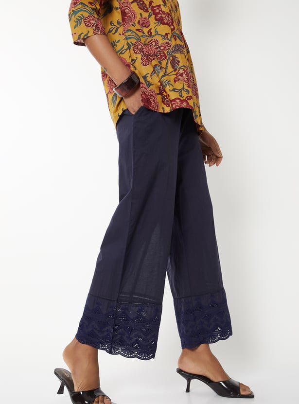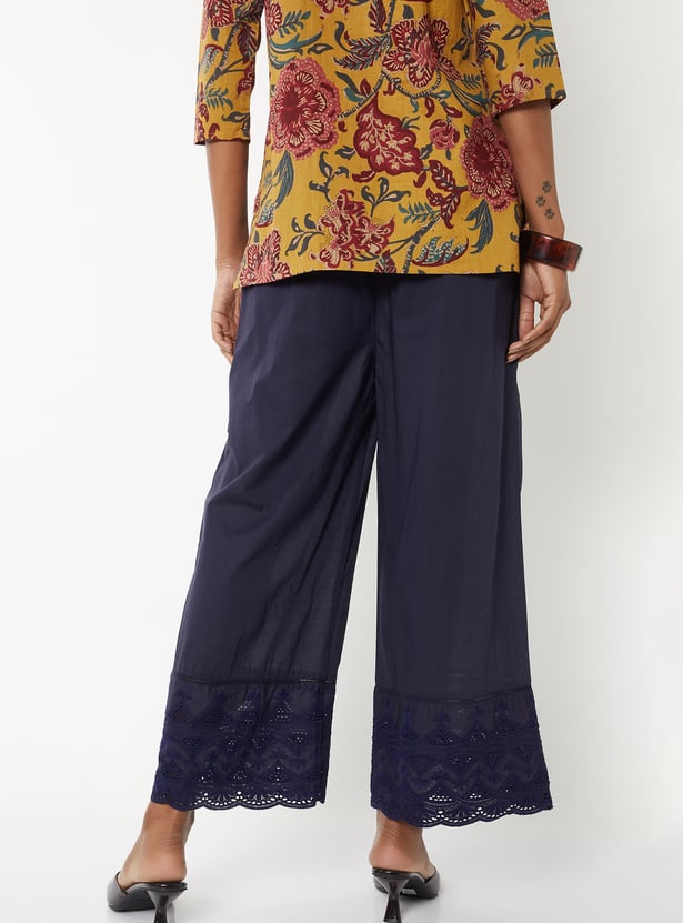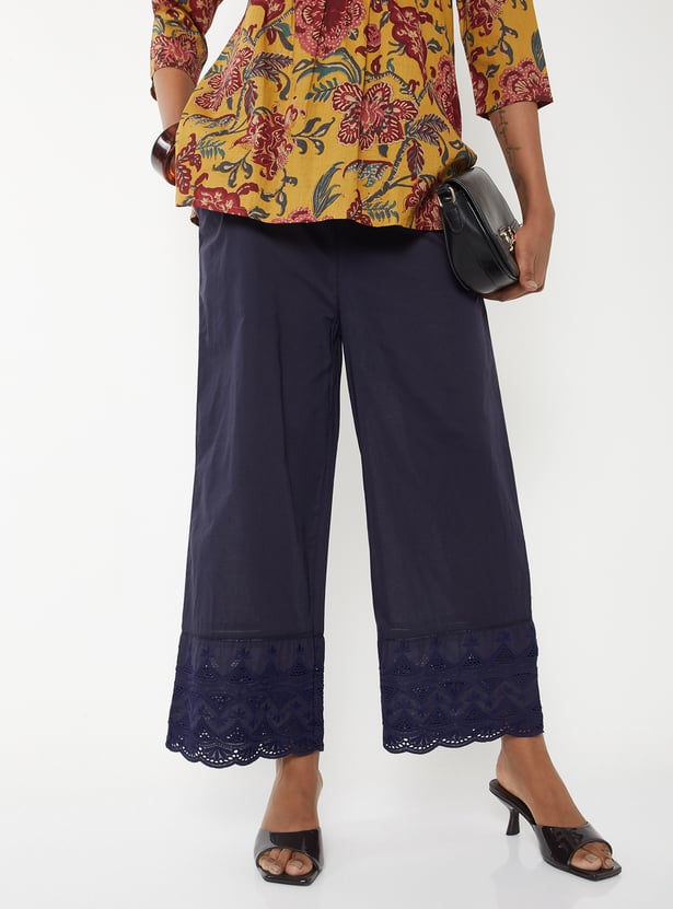 Breeze through the day in style in this pair of palazzos. It features an elasticated waist, side pockets, an embroidered panel, and a scalloped trim at the hem. Team up this pair with a top and heels.
