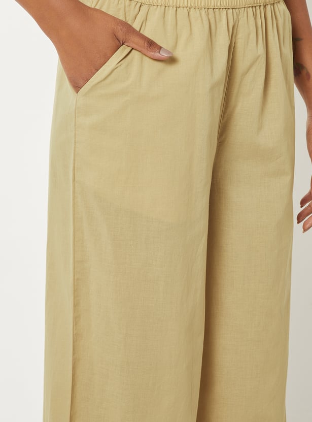 Breeze through the day in style in this pair of palazzos. It features an elasticated waist, side pockets, an embroidered panel, and a scalloped trim at the hem. Team up this pair with a top and heels.
