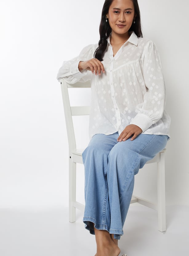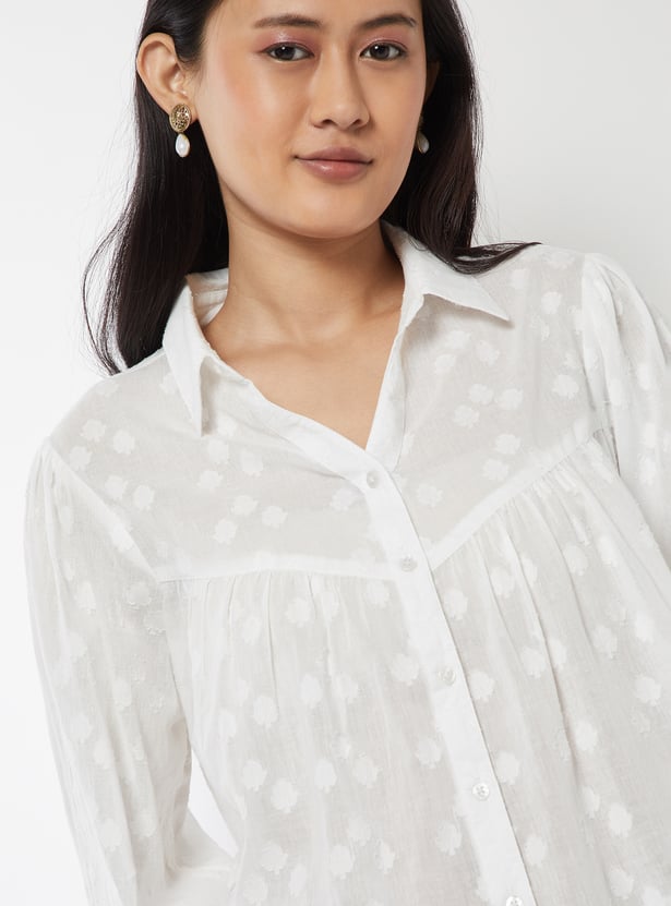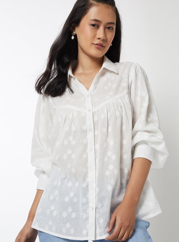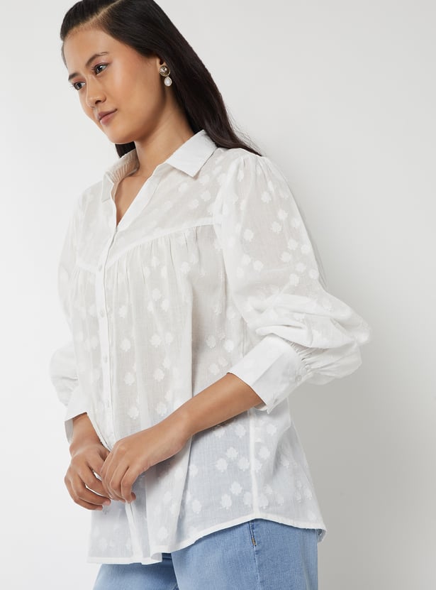 Add a refined touch to your wardrobe with this embroidered shirt style top. Designed with a spread collar, button placket, and full sleeves with button cuffs, it blends classic structure with delicate detailing.