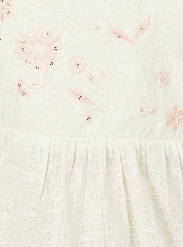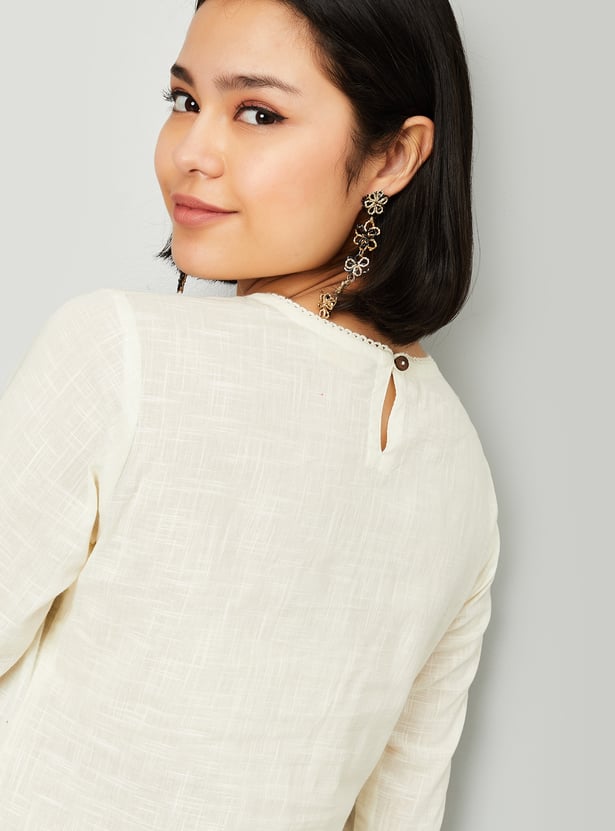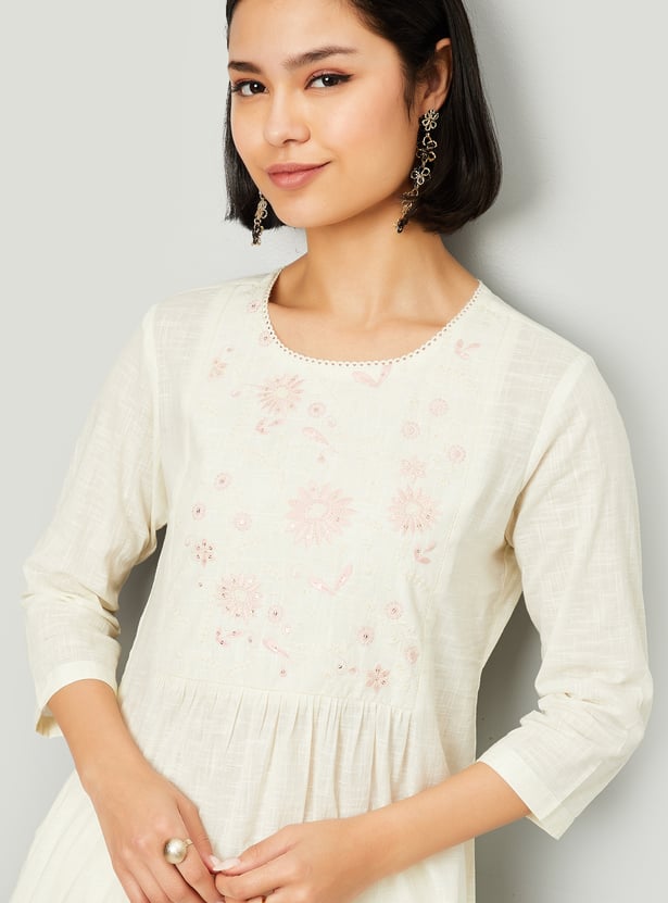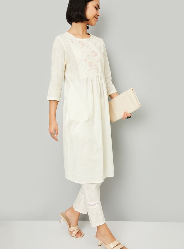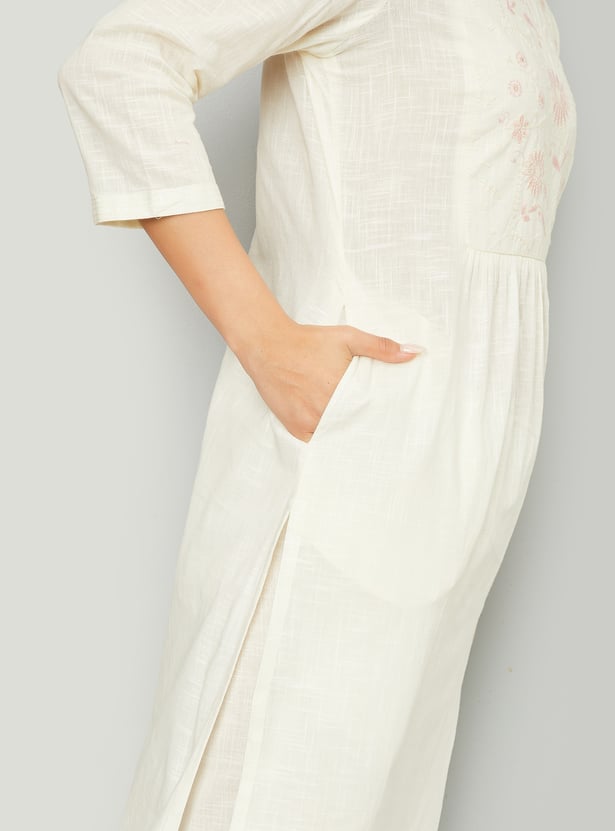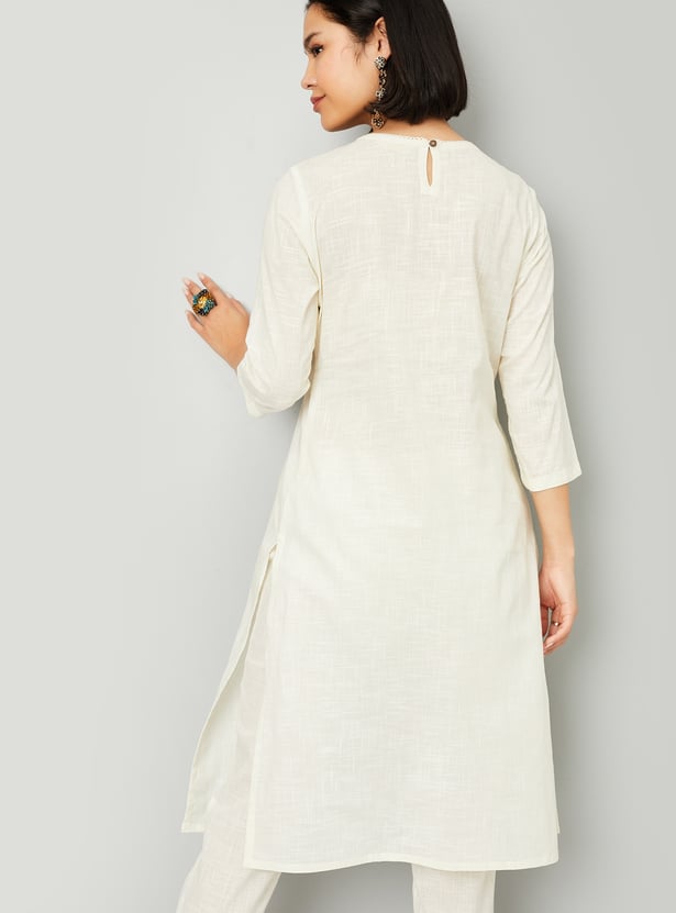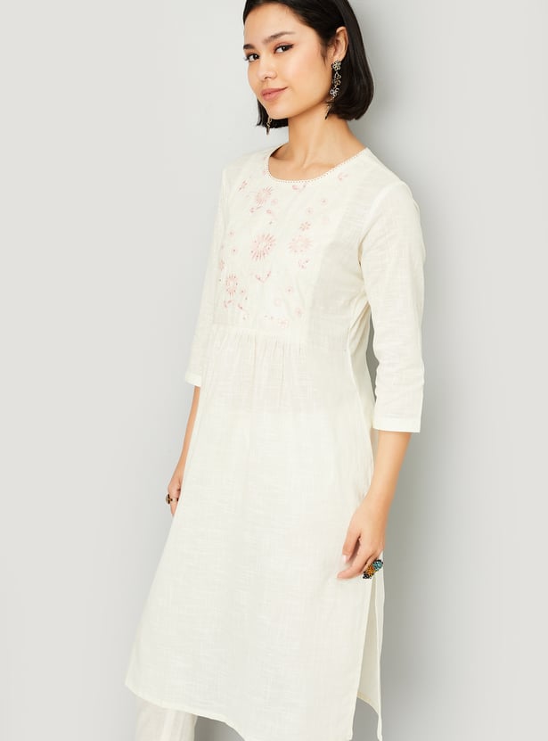 Create an effortless look with this straight kurta. It features three-quarter sleeves and a round neckline adorned with an embroidered yoke. The side slits and calf-length cut add a touch of elegance, making it a versatile piece.