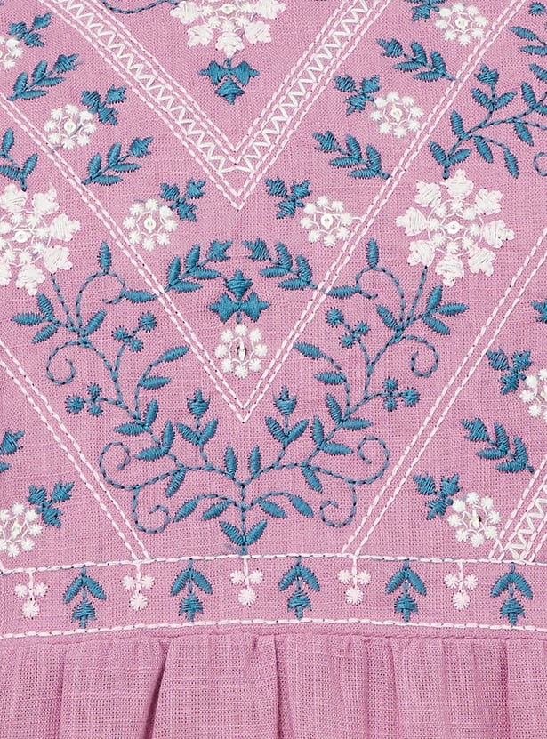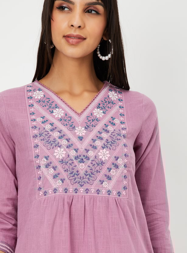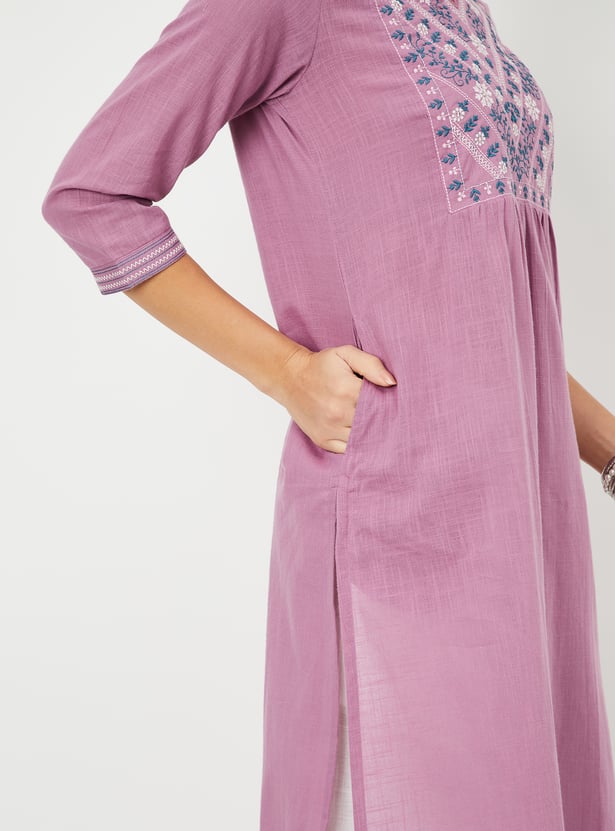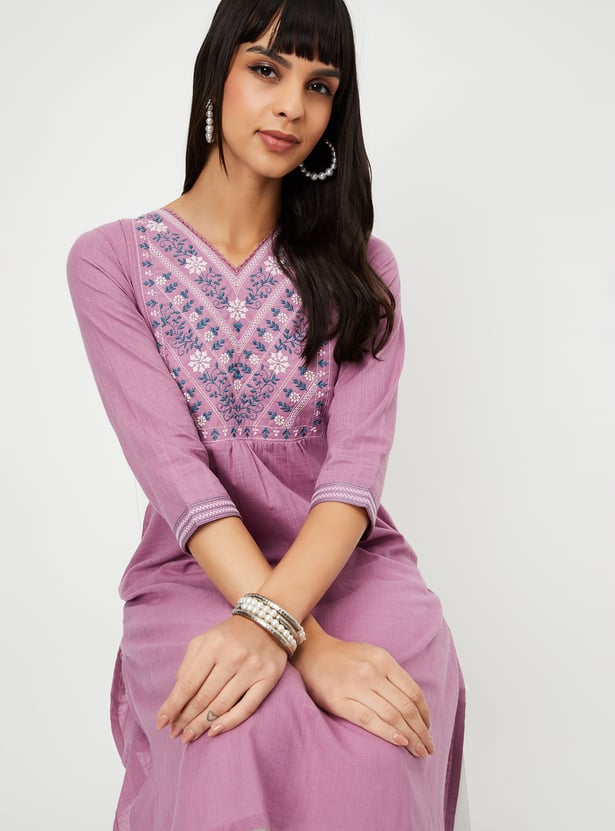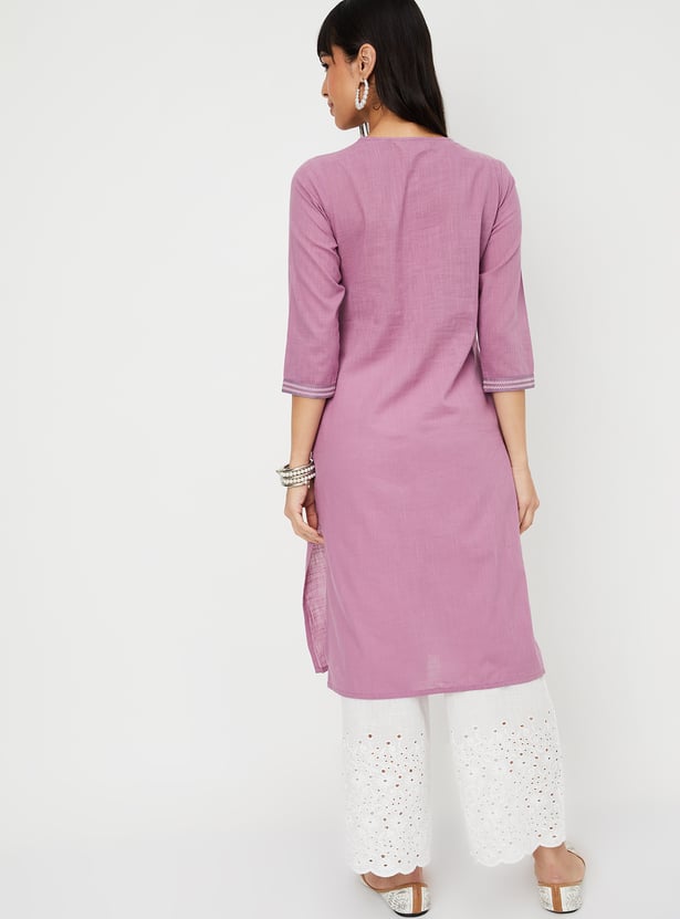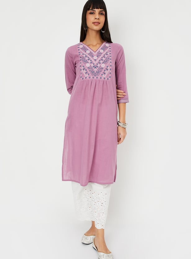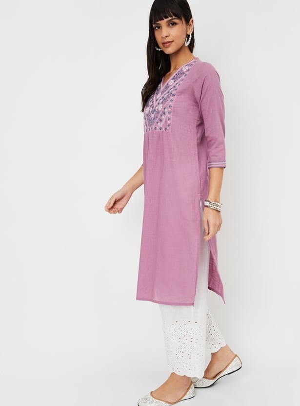 Elevate your everyday ethnic wear with this embroidered straight kurta. Featuring a V-neck and 3/4th sleeves, side slits, it blends traditional charm with modern comfort. Side slits add ease of movement and a sleek finish to the silhouette.