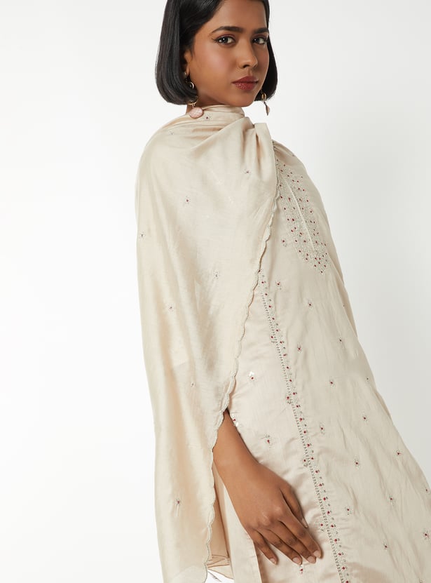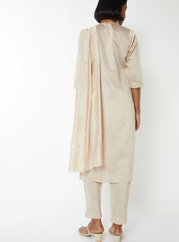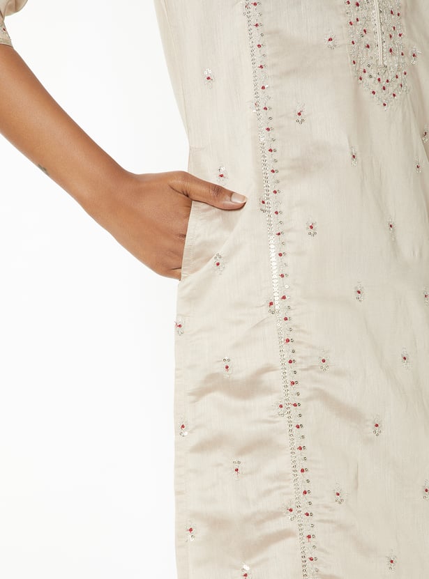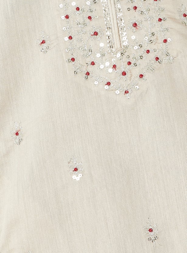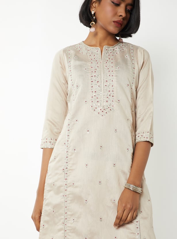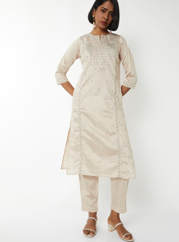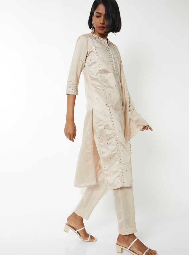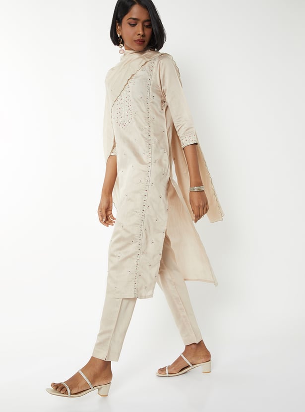 Step out in graceful style with this embroidered straight kurta set. The kurta features a notch neck, 3/4th sleeves, side pocket, and side slits for ease. It is paired with straight pants with an elasticated waist for all-day comfort and matching dupatta.