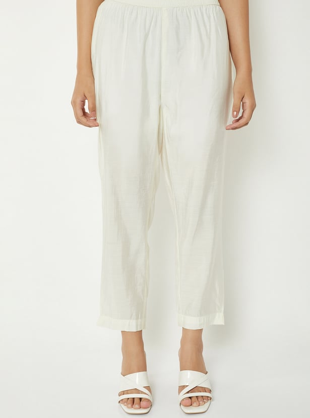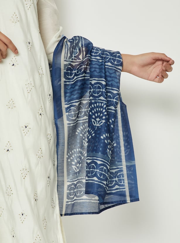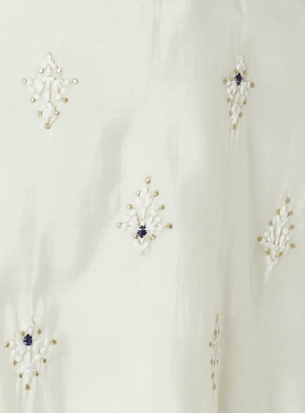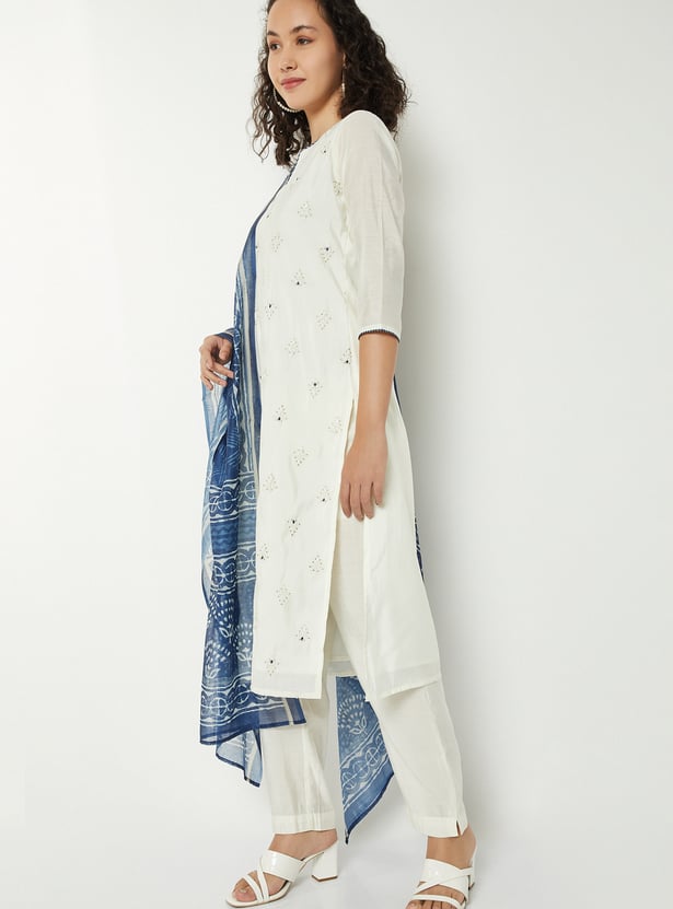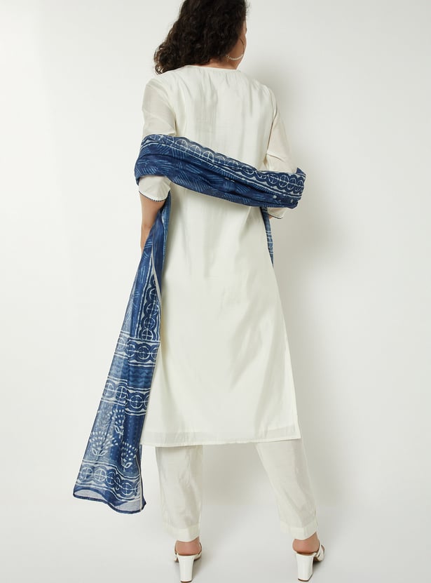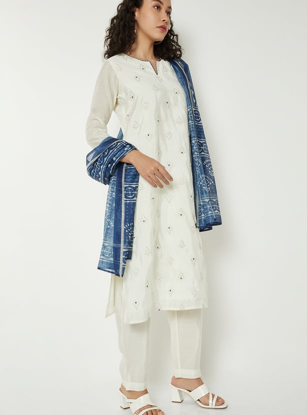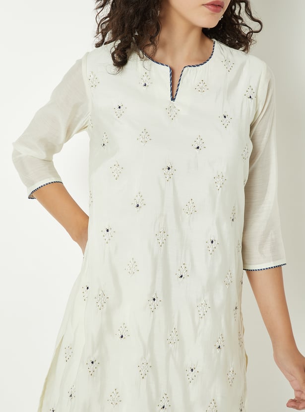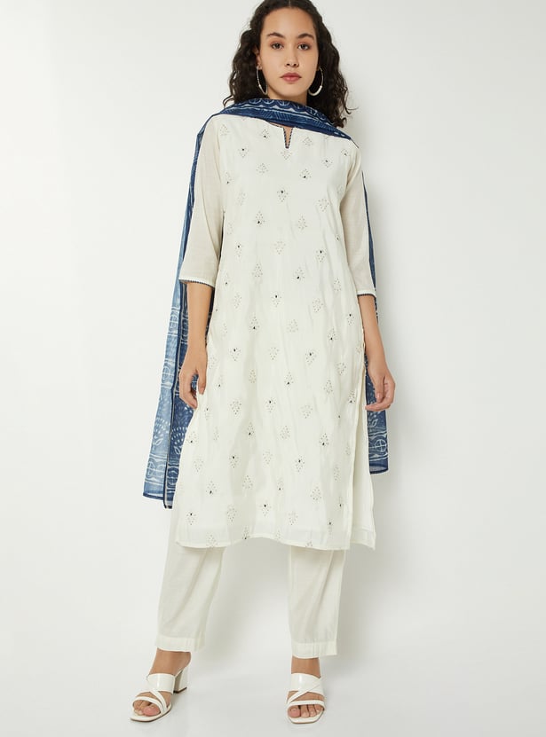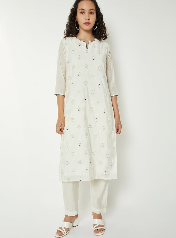 Elegant and refined, this embroidered straight kurta set features a notch neck, 3/4th sleeves, and side slits for ease and comfort. It is paired with straight pants that have an elasticated waist, ensuring a perfect blend of style and practicality.