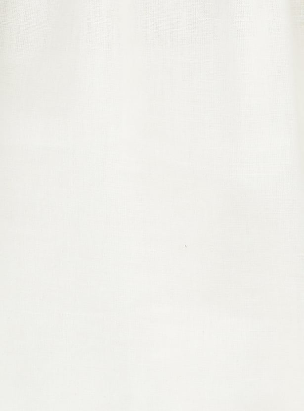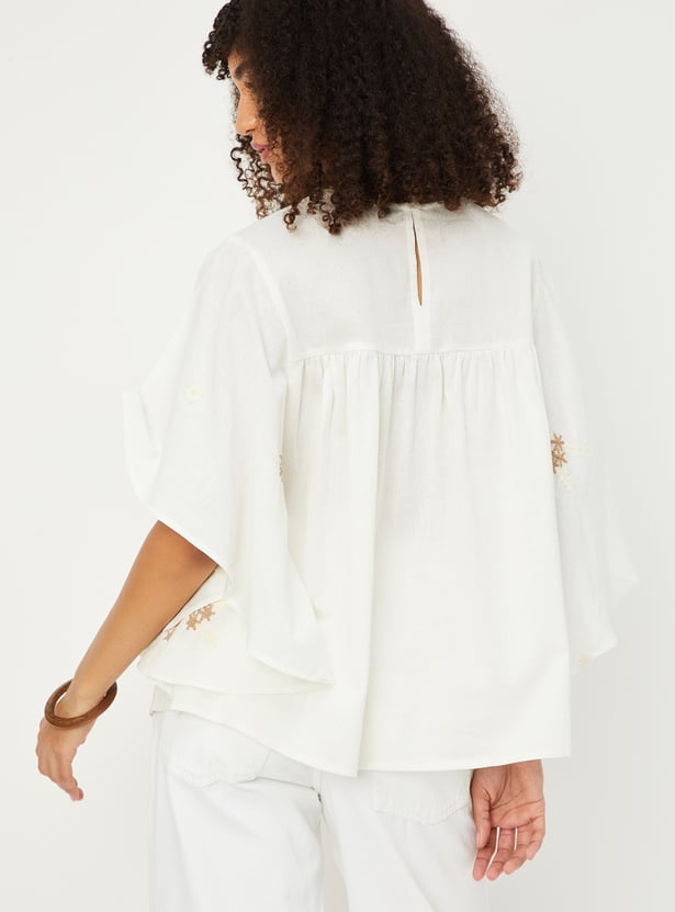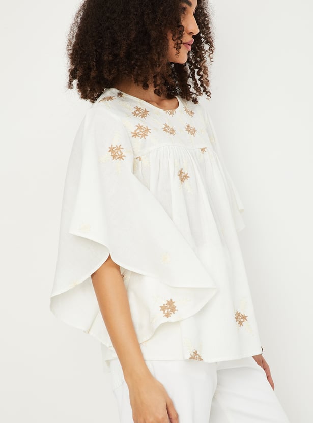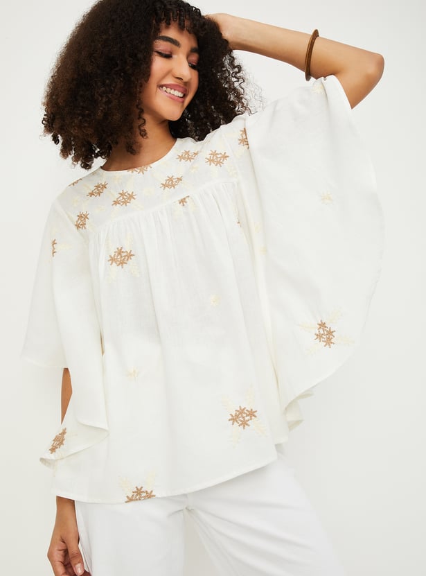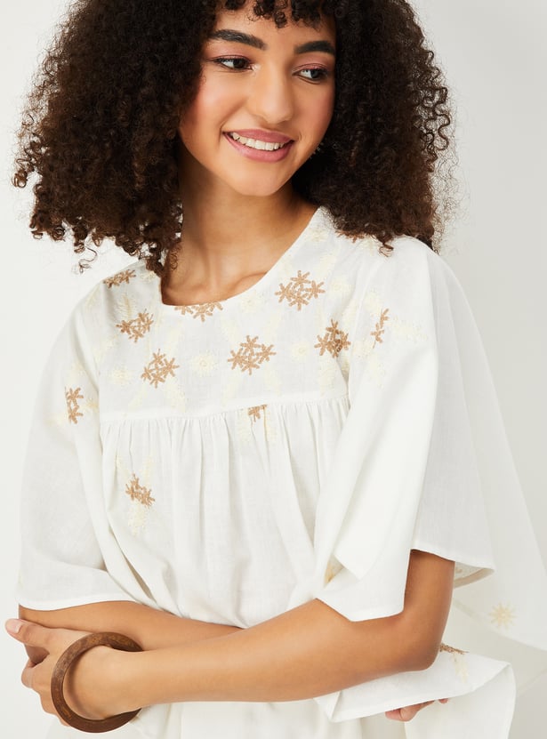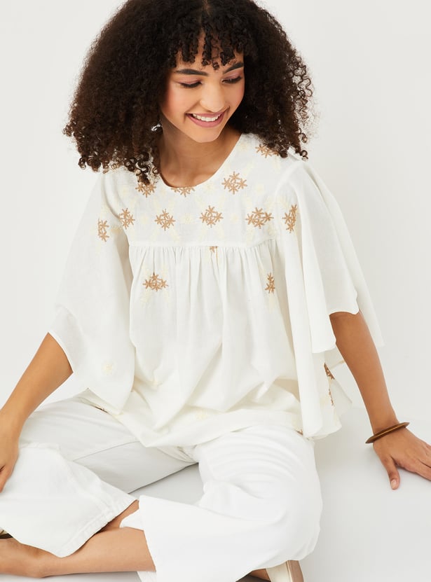Elegant and airy, this tunic features intricate embroidery, a round neck, button closure, and flowy batwing 3/4th sleeves for a graceful, relaxed fit.