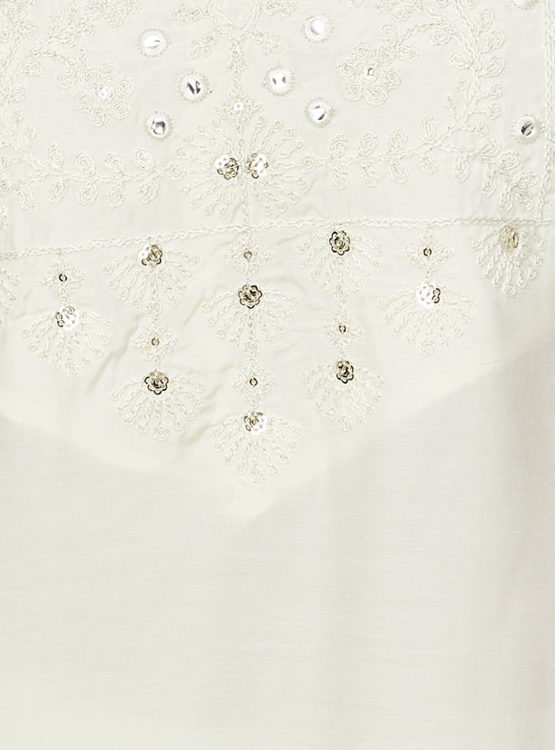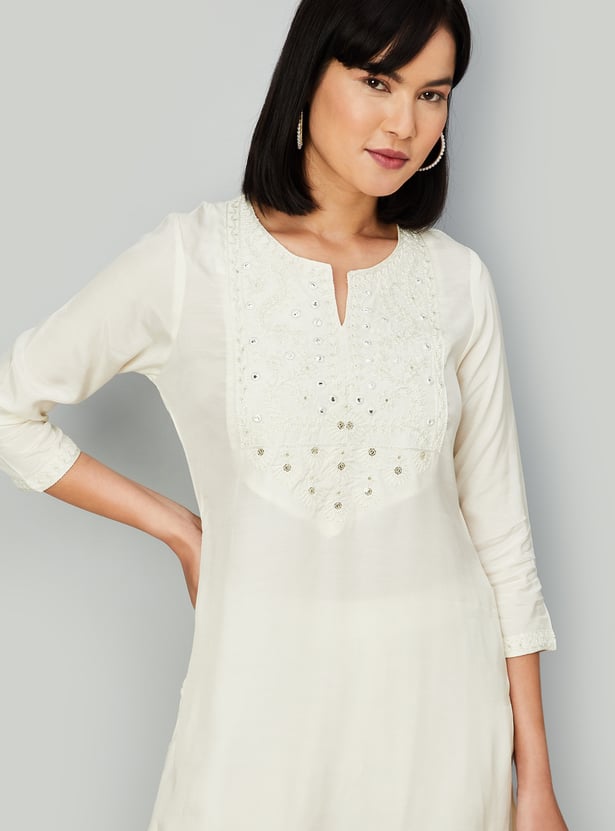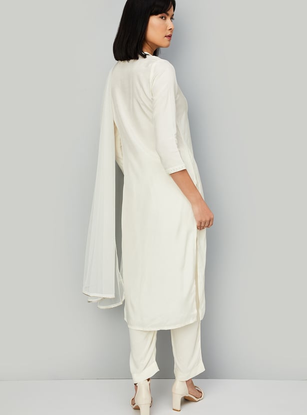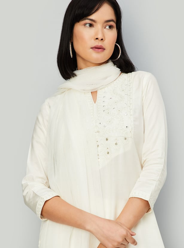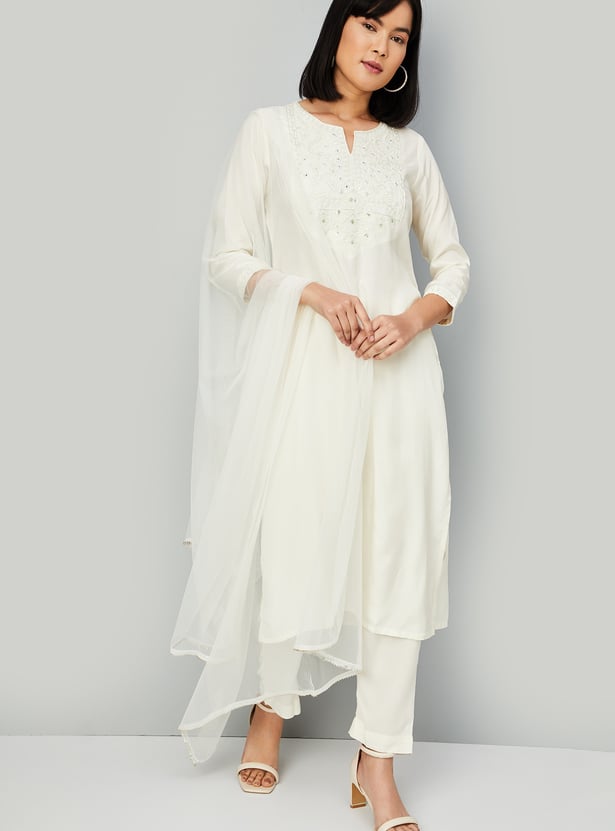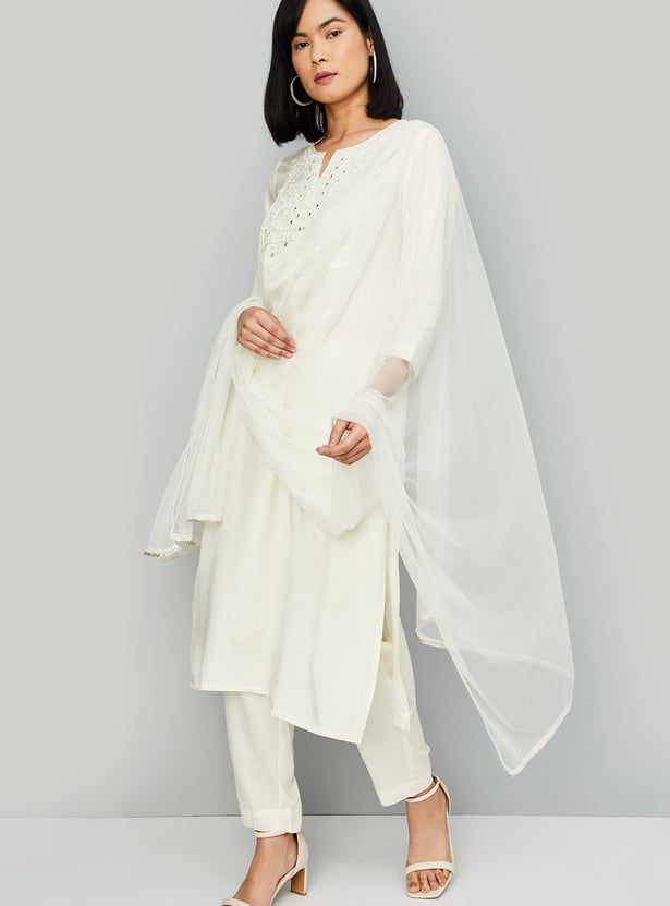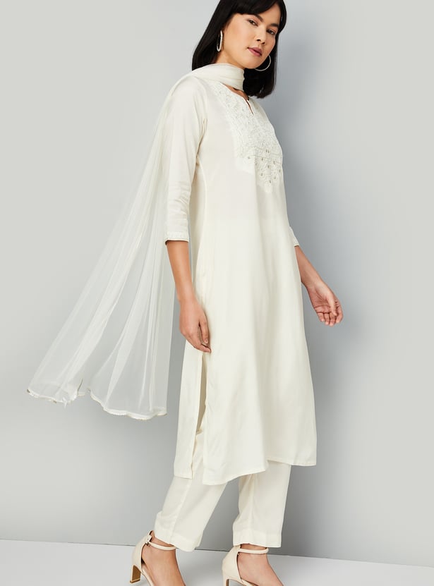 Experience timeless elegance with this enchanting kurta set. Adorned with intricate yoke embroidery, it features a classic notched neck and graceful three-quarter sleeves. Paired with matching straight pants with an elasticated waistband for comfort, and finished with a dupatta, it embodies ethnic charm.