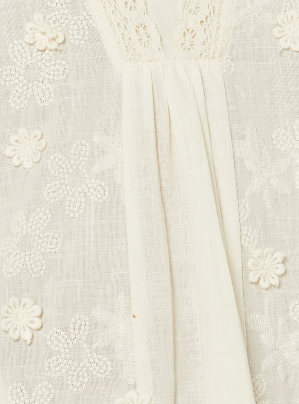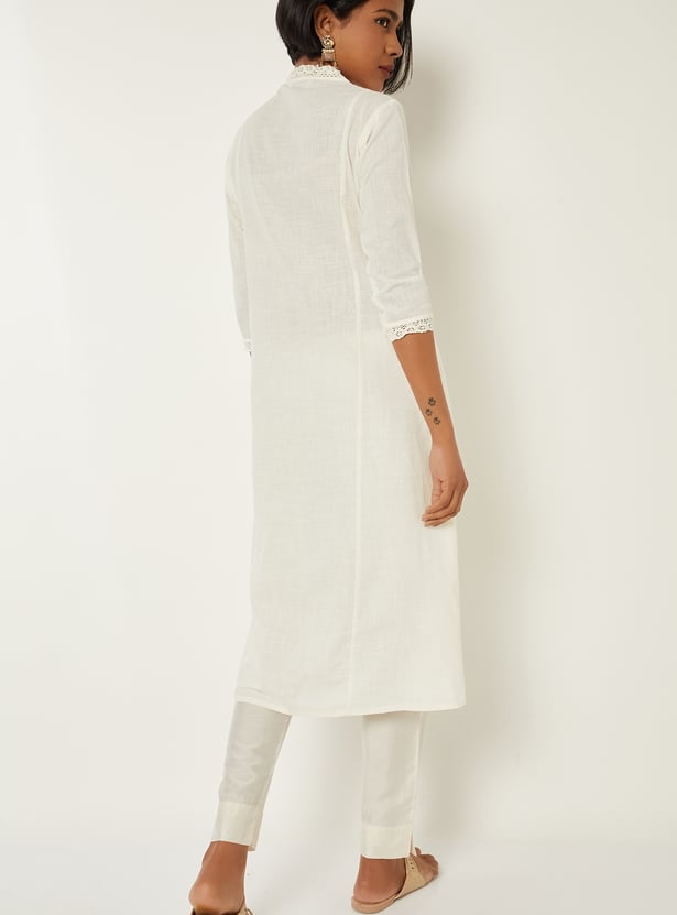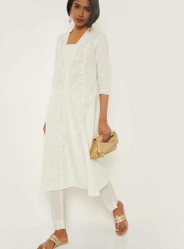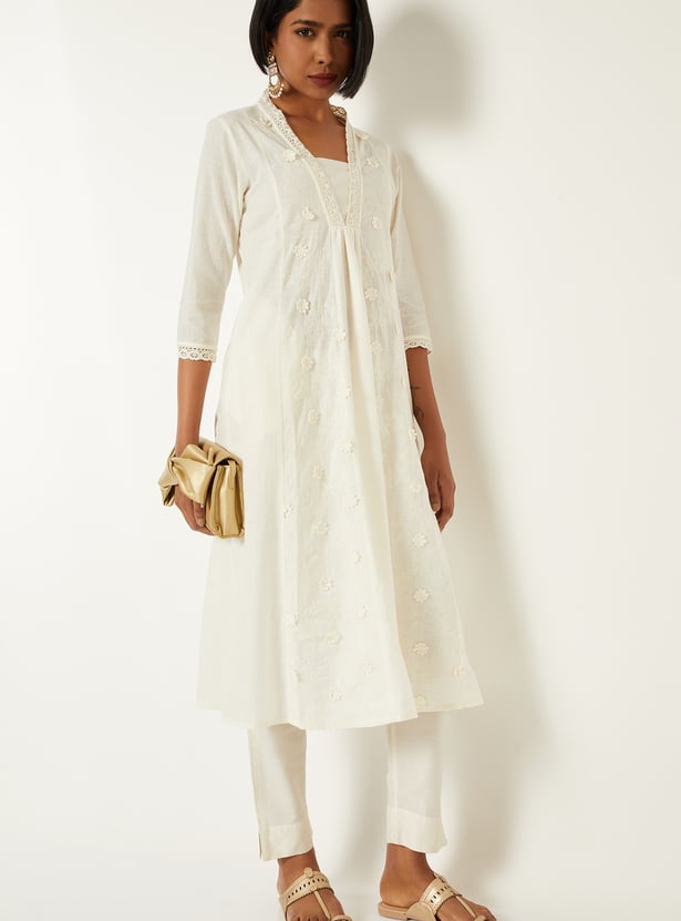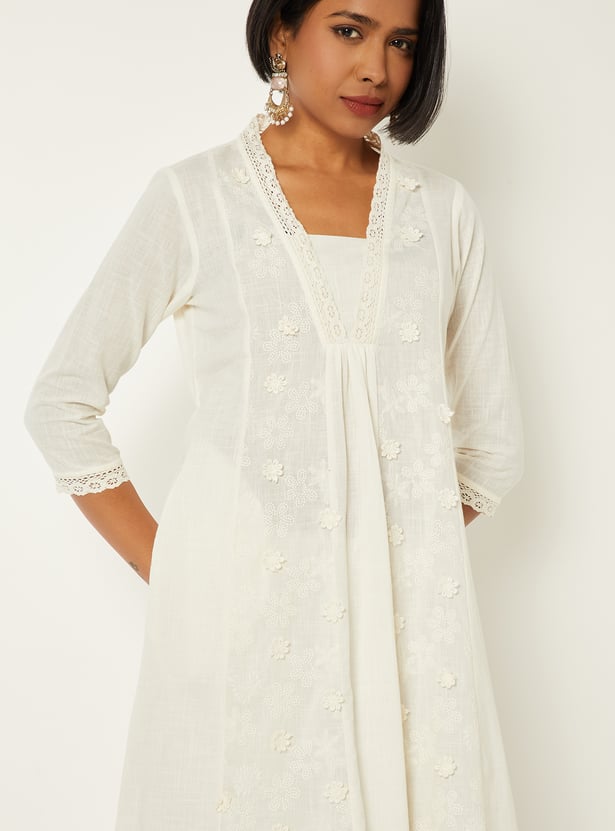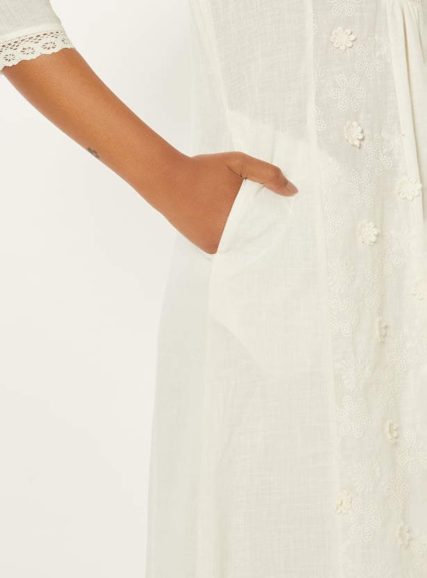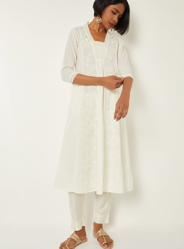 Flaunt your elegance with this kalidar kurta. It features a stylised neckline, 3/4th sleeves, and kalidar panels. The floral appliques and embroidery, along with lace trim, give a delicate look.