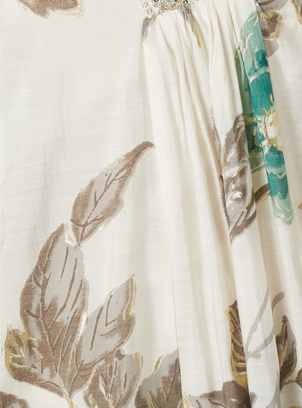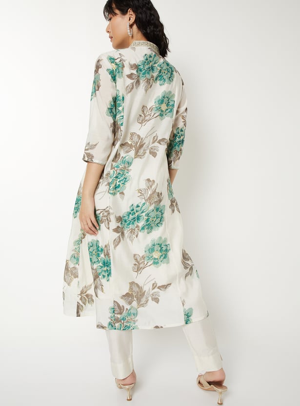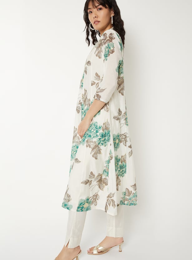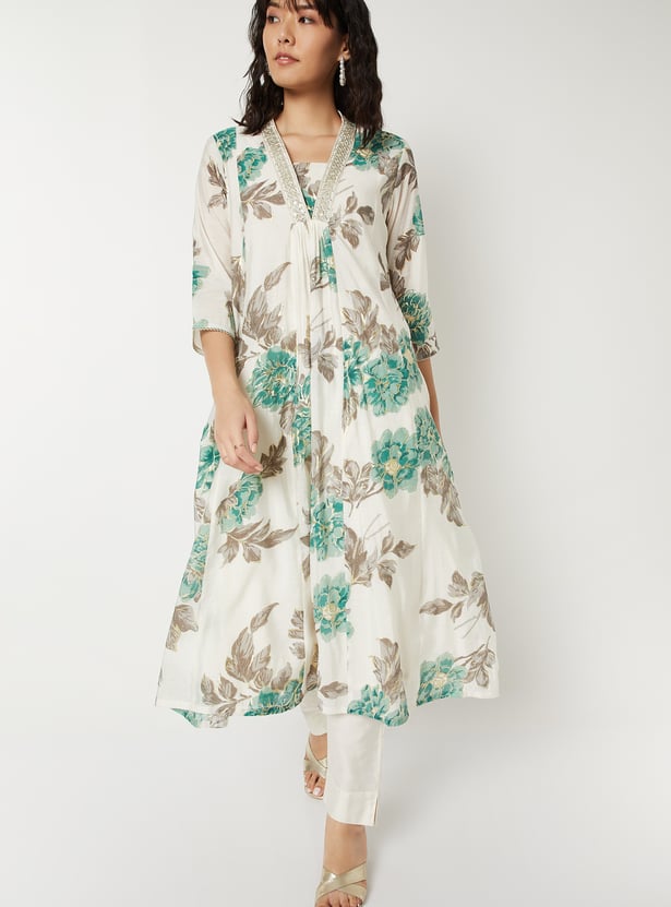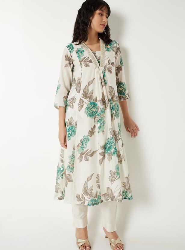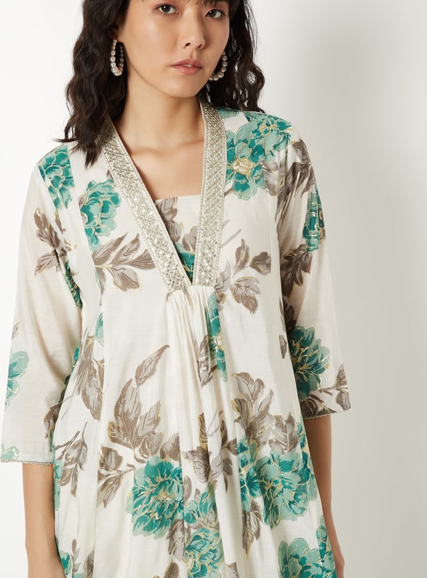 Chic and comfortable, this floral print kalidar kurta features a flattering neckline, 3/4th sleeves, and a gathered detail—perfect for everyday elegance.