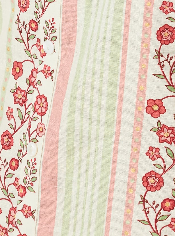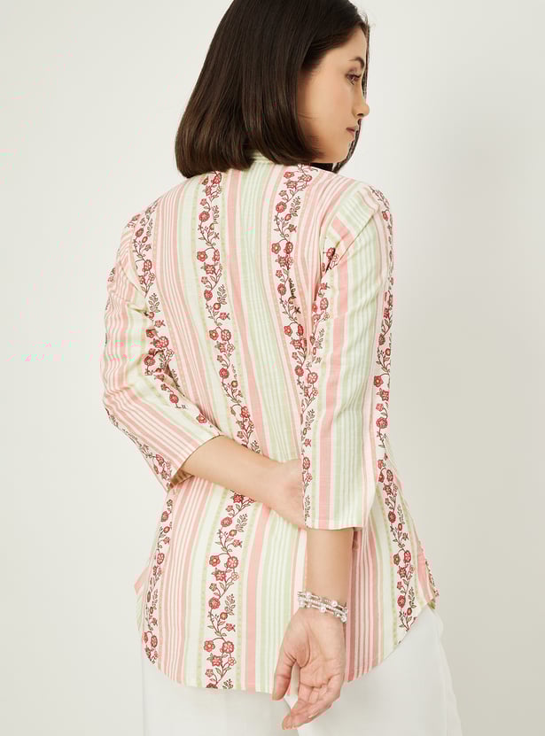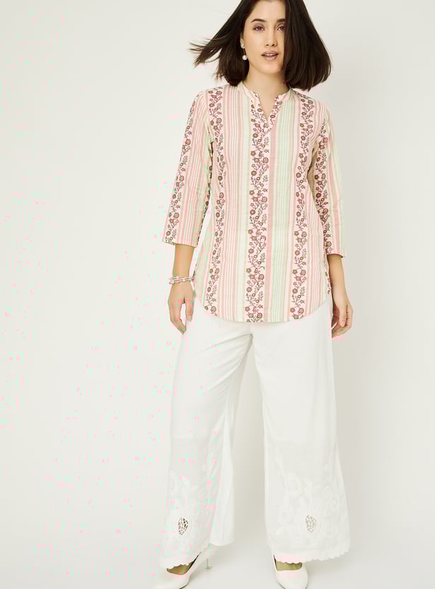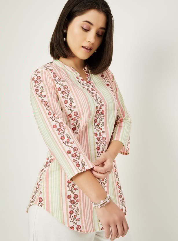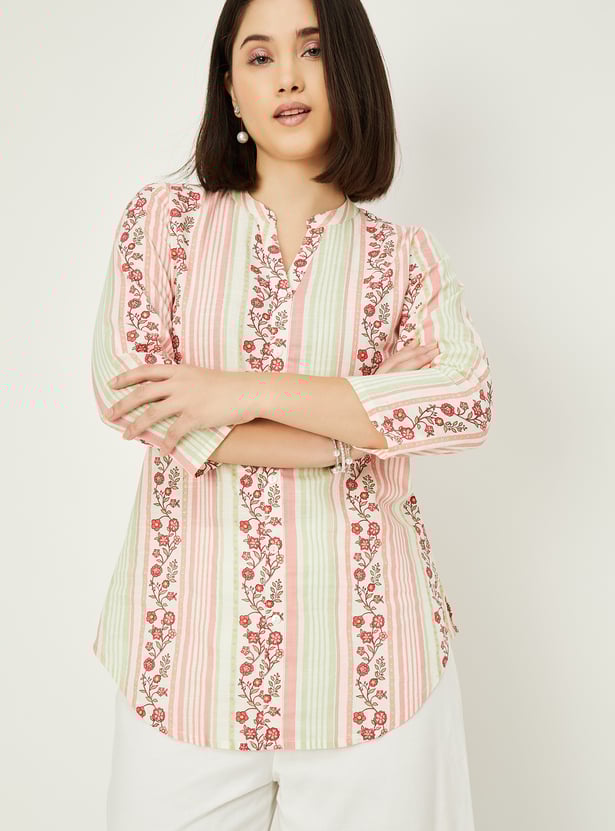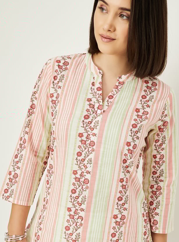 This floral print kurti brings a fresh, feminine charm with its vibrant pattern, band collar, and 3/4th sleeves. The breezy silhouette makes it perfect for both everyday wear and festive occasions.