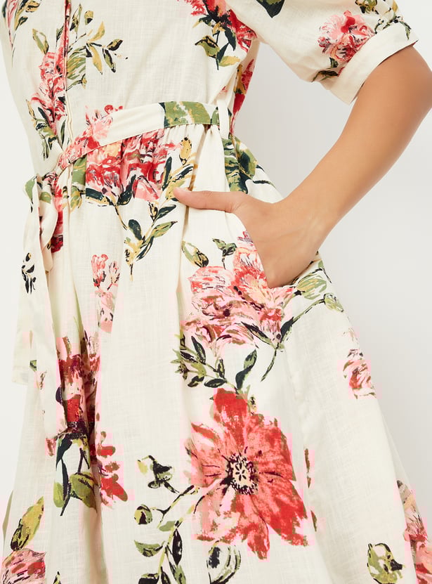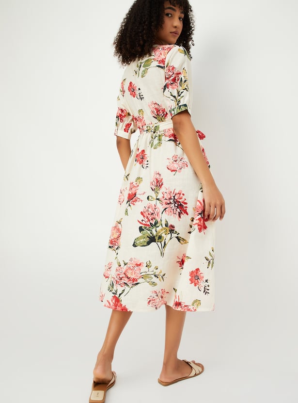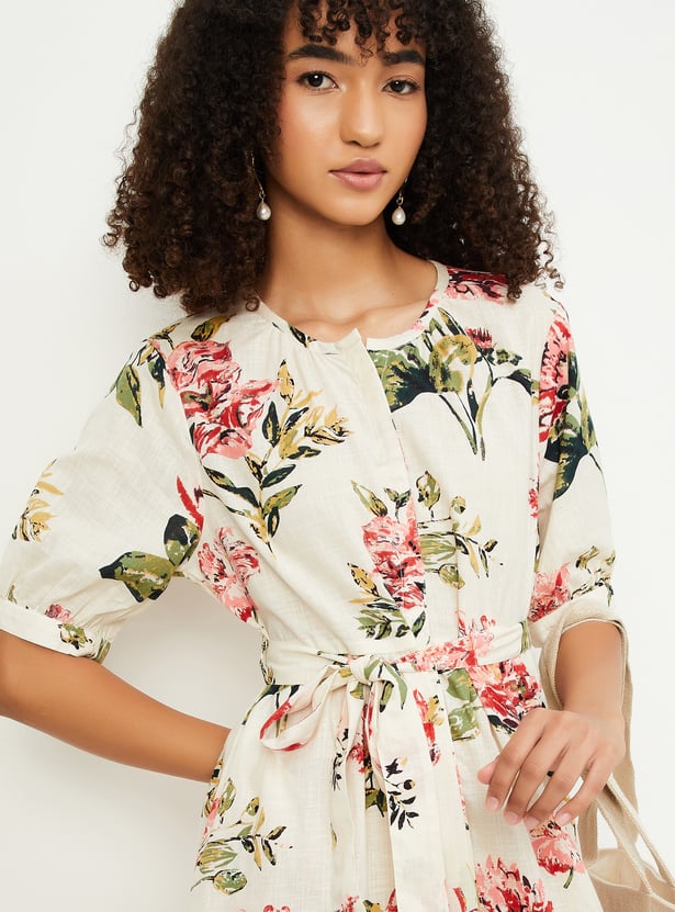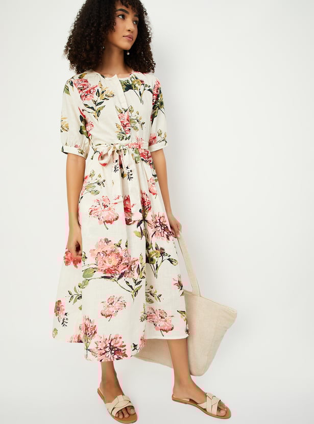 Embrace effortless femininity with this floral print midi dress, perfect for everyday elegance. It features a round neckline, button placket, and half sleeves for a classic look, while the tie-up waist gently cinches the silhouette.