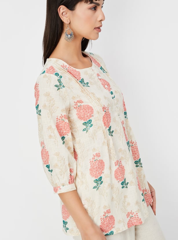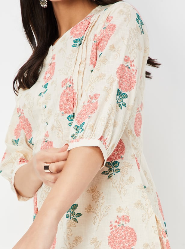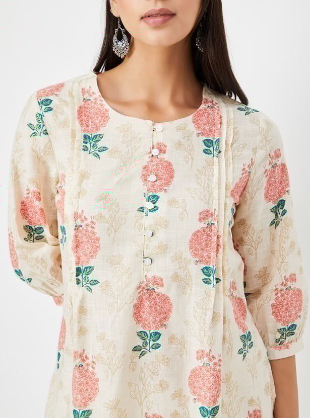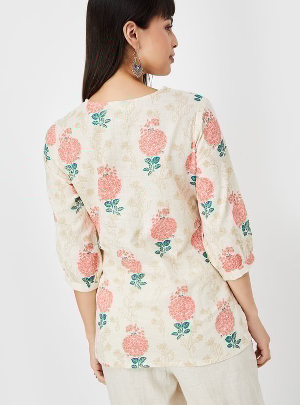 This floral print short kurti features a vibrant, eye-catching pattern with a classic round neck and 3/4th sleeves. Perfect for adding a pop of color and style to your casual wardrobe, it’s both comfortable and chic.