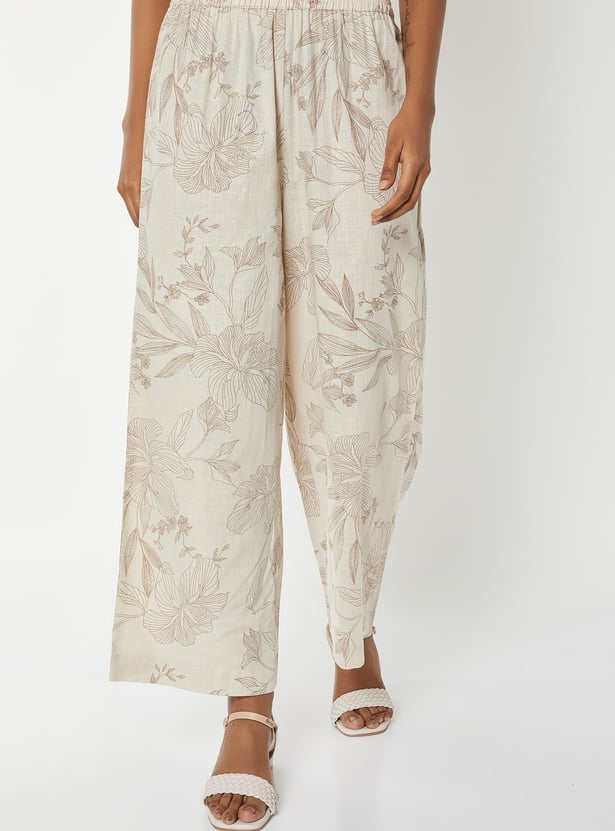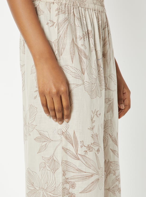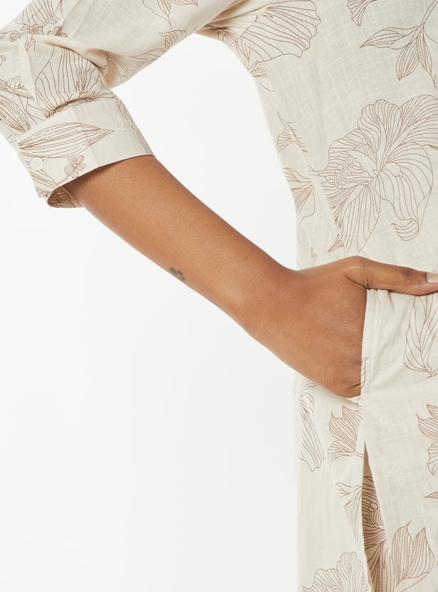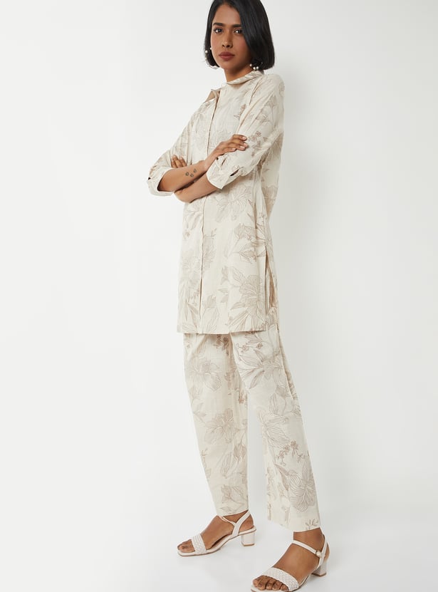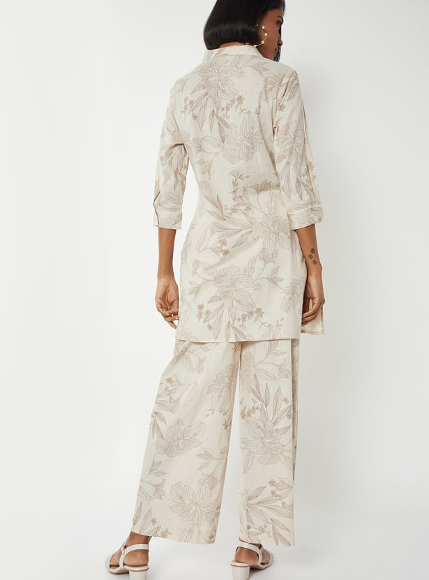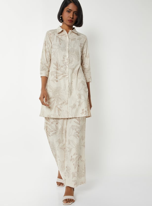 Add charm to your ethnic wardrobe with this floral print co-ords set designed for effortless elegance. The shirt features a spread collar, 3/4th sleeves, and side slits, paired with palazzos that have an elasticated waistband for comfort.